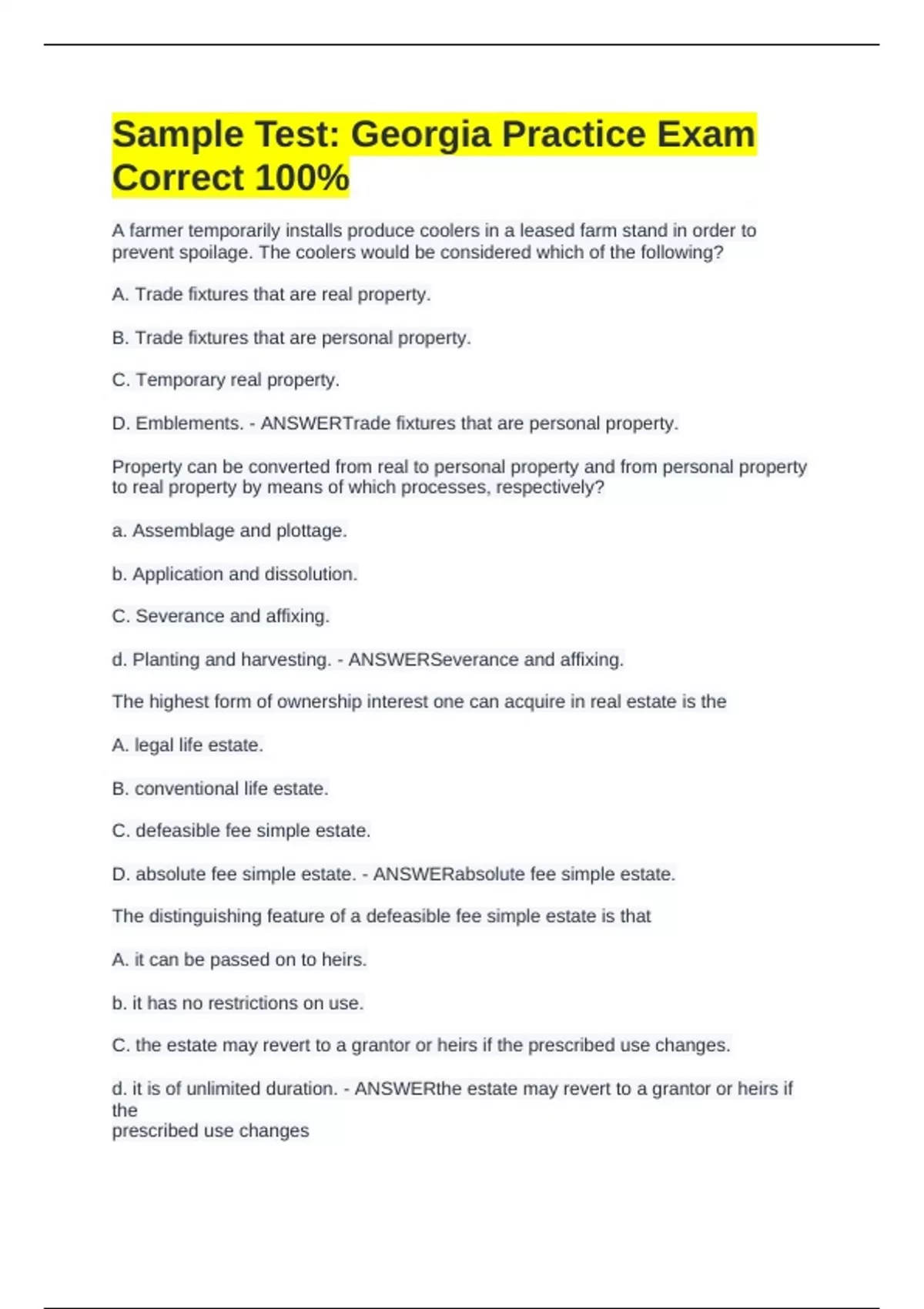 A farmer temporarily installs produce coolers in a leased farm stand in order to prevent spoilage. The coolers would be considered which of the following? A. Trade fixtures that are real property. B. Trade fixtures that are personal property. C. Temporary real property. D. Emblements. - ANSWERTrade fixtures that are personal property. Property can be converted from real to personal property and from personal property to real property by means of which processes, respectively? a. Assemblage and plottage. b. Application and dissolution. C. Severance and affixing. d. Planting and harvesting. - ANSWERSeverance and affixing. The highest form of ownership interest one can acquire in real estate is the A. legal life estate. B. conventional life estate. C. defeasible fee simple estate. D. absolute fee simple estate. - ANSWERabsolute fee simple estate. The distinguishing feature of a defeasible fee simple estate is that A. it can be passed on to heirs. b. it has no restrictions on use. C. the estate may revert to a grantor or heirs if the prescribed use changes. d. it is
