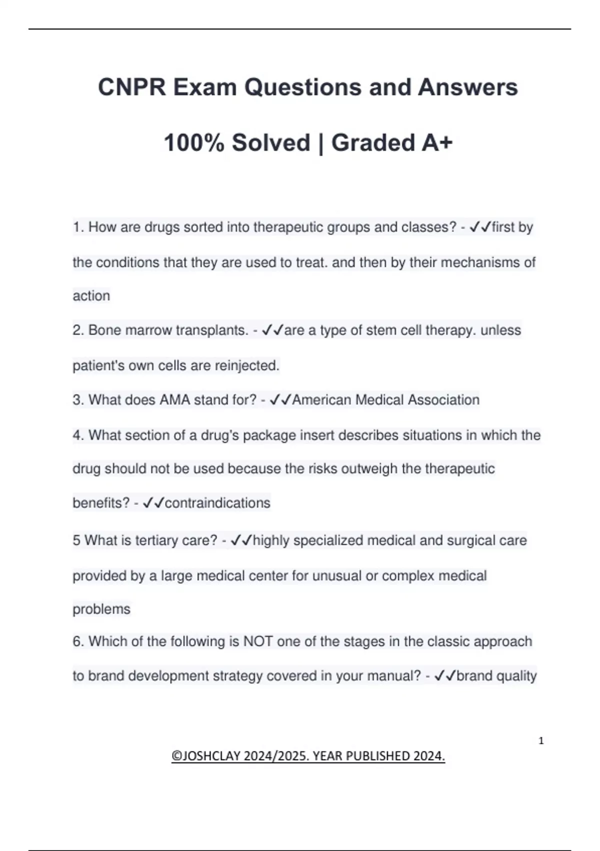 CNPR Exam Questions and Answers 100% Solved | Graded A+ 1. How are drugs sorted into therapeutic groups and classes? - first by the conditions that they are used to treat. and then by their mechanisms of action 2. Bone marrow transplants. - are a type of stem cell therapy. unless patient's own cells are reinjected. 3. What does AMA stand for? - American Medical Association 4. What section of a drug's package insert describes situations in which the drug should not be used because the risks outweigh the therapeutic benefits? - contraindications 5 What is tertiary care? - highly specialized medical and surgical care provided by a large medical center for unusual or complex medical problems 6. Which of the following is NOT one of the stages in the classic approach to brand development strategy covered in your manual? - brand quality
