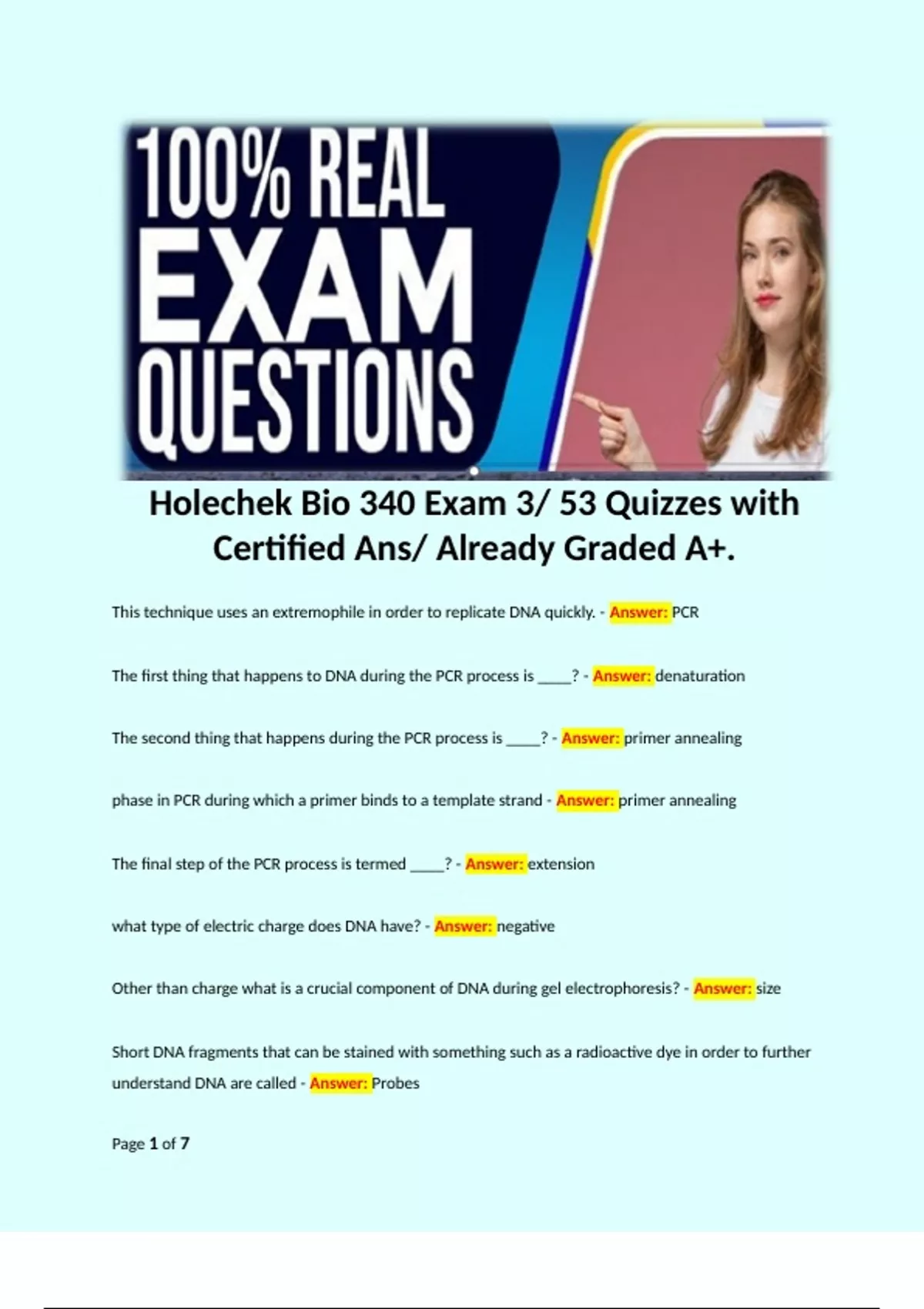 Holechek Bio 340 Exam 3/ 53 Quizzes with Certified Ans/ Already Graded A+. This technique uses an extremophile in order to replicate DNA quickly. - Answer: PCR The first thing that happens to DNA during the PCR process is ____? - Answer: denaturation The second thing that happens during the PCR process is ____? - Answer: primer annealing phase in PCR during which a primer binds to a template strand - Answer: primer annealing The final step of the PCR process is termed ____? - Answer: extension what type of electric charge does DNA have? - Answer: negative Other than charge what is a crucial component of DNA during gel electrophoresis? - Answer: size Short DNA fragments that can be stained with something such as a radioactive dye in order to further understand DNA are called - Answer: Probes Transfer of replicated DNA from a donor to a recipient - Answer: Conjugation In bacteria, the direct transfer of DNA between two cells that are temporarily joined. - Answer: Conjugation What important structure is used to transfer replicated DNA during conjugation - Answer: Pilus Where does the DNA come from during transformation? - Answer: enviroment
