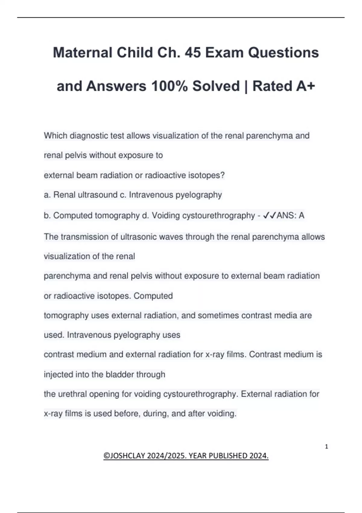 Maternal Child Ch. 45 Exam Questions and Answers 100% Solved | Rated A+ Which diagnostic test allows visualization of the renal parenchyma and renal pelvis without exposure to external beam radiation or radioactive isotopes? a. Renal ultrasound c. Intravenous pyelography b. Computed tomography d. Voiding cystourethrography - ANS: A The transmission of ultrasonic waves through the renal parenchyma allows visualization of the renal parenchyma and renal pelvis without exposure to external beam radiation or radioactive isotopes. Computed tomography uses external radiation, and sometimes contrast media are used. Intravenous pyelography uses contrast medium and external radiation for x-ray films. Contrast medium is injected into the bladder through the urethral opening for voiding cystourethrography. External radiation for x-ray films is used before, during, and after voiding.