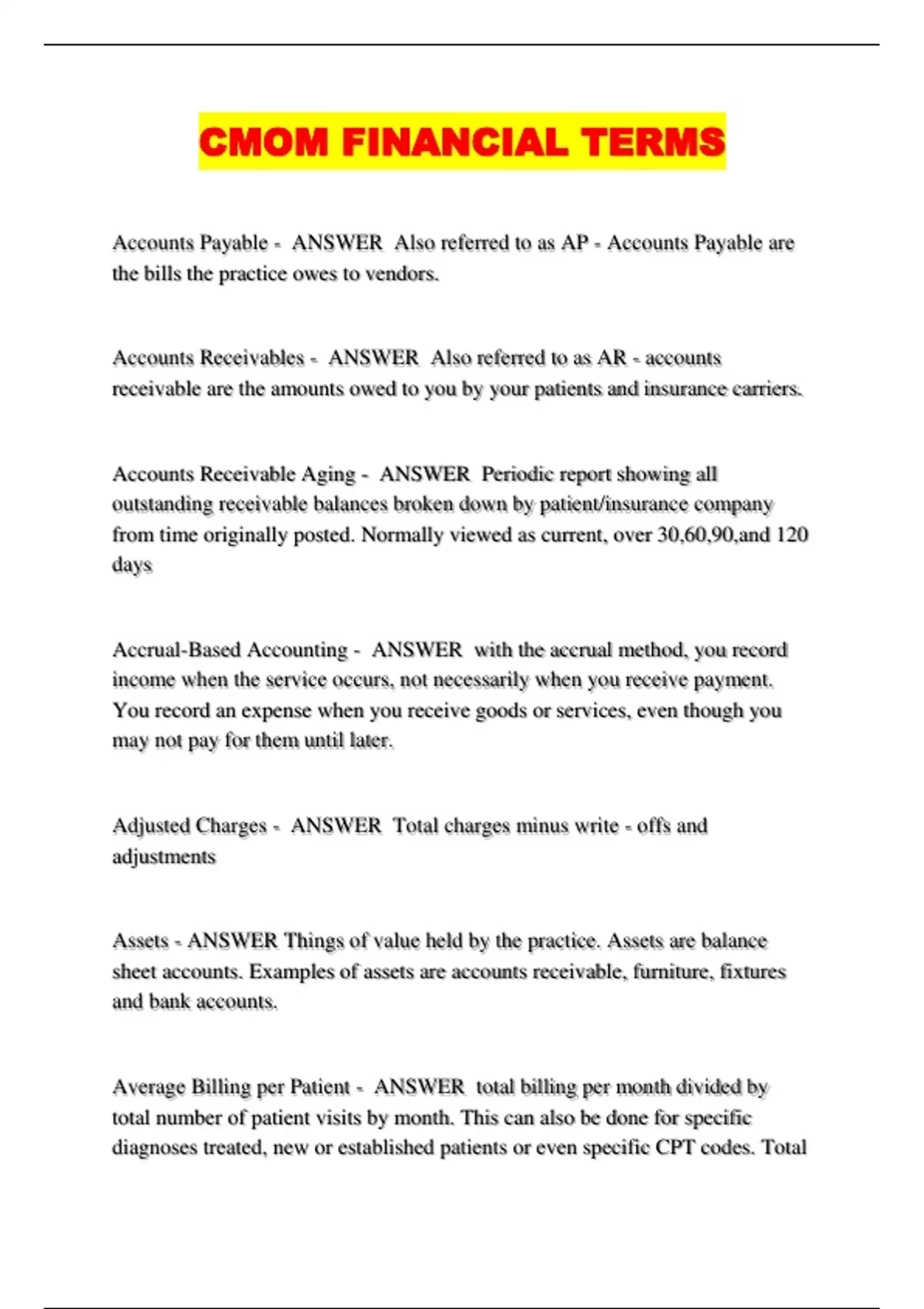 Balance Sheet - ANSWER A snapshot of the practice at one point in time. The