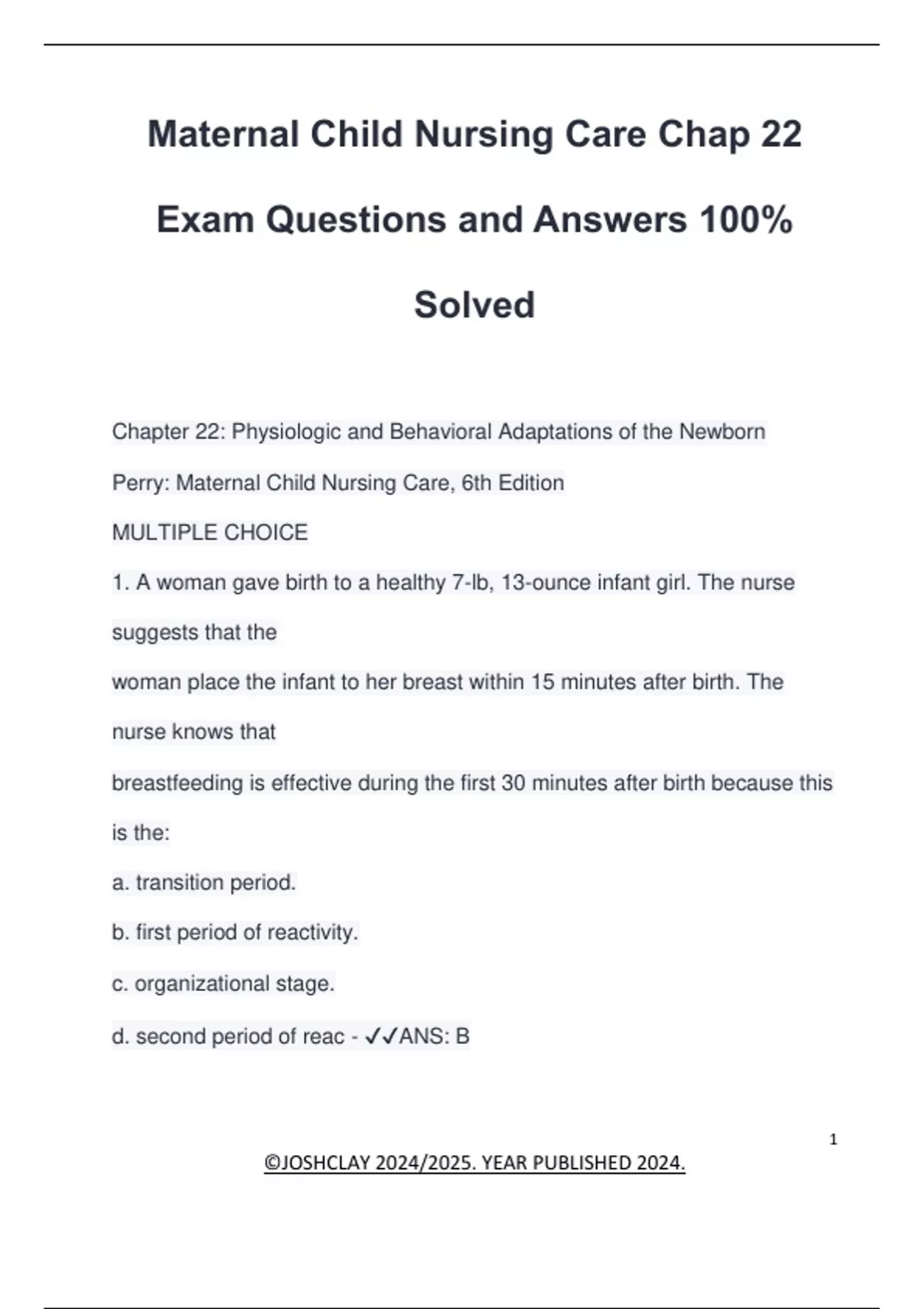 Maternal Child Nursing Care Chap 22 Exam Questions and Answers 100% Solved Chapter 22: Physiologic and Behavioral Adaptations of the Newborn Perry: Maternal Child Nursing Care, 6th Edition MULTIPLE CHOICE 1. A woman gave birth to a healthy 7-lb, 13-ounce infant girl. The nurse suggests that the woman place the infant to her breast within 15 minutes after birth. The nurse knows that breastfeeding is effective during the first 30 minutes after birth because this is the: a. transition period. b. first period of reactivity. c. organizational stage. d. second period of reac - ANS: B