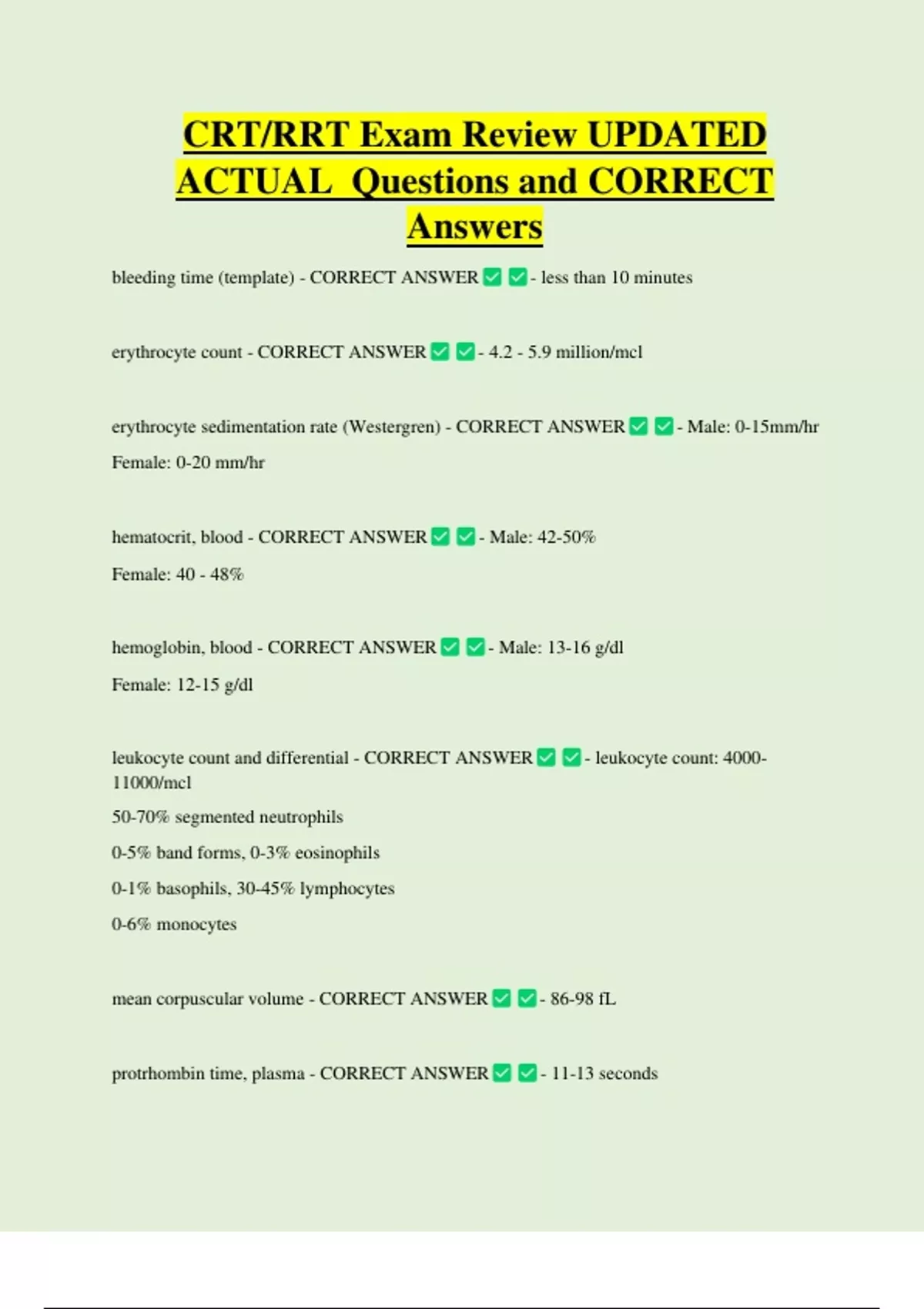 CRT/RRT Exam Review UPDATED ACTUAL Questions and CORRECT Answers bleeding time (template) - CORRECT ANSWER - less than 10 minutes erythrocyte count - CORRECT ANSWER - 4.2 - 5.9 million/mcl