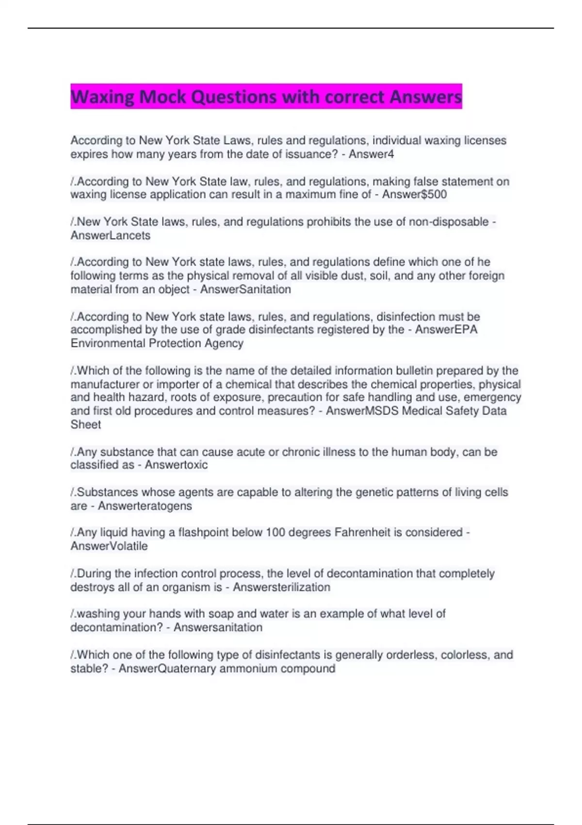 Waxing Mock Questions with correct Answers According to New York State Laws, rules and regulations, individual waxing licenses expires how many years from the date of issuance? - Answer4 /.According to New York State law, rules, and regulations, making false statement on waxing license application can result in a maximum fine of - Answer$500 /.New York State laws, rules, and regulations prohibits the use of non-disposable - AnswerLancets /.According to New York state laws, rules, and regulations define which one of he following terms as the physical removal of all visible dust, soil, and any other foreign material from an object - AnswerSanitation /.According to New York state laws, rules, and regulations, disinfection must be accomplished by the use of grade disinfectants registered by the - AnswerEPA Environmental Protection Agency /.Which of the following is the name of the detailed information bulletin prepared by the manufacturer or importer of a chemical that describes the chemical properties, physical and health hazard, roots of exposure, precaution for safe handling and use, emergency and first old procedures and control measures? - AnswerMSDS Medical Safety Data Sheet /.Any substance that can cause acute or chronic illness to the human body, can be classified as - Answertoxic /.Substances whose agents are capable to altering the genetic patterns of living cells are - Answerteratogens /.Any liquid having a flashpoint below 100 degrees Fahrenheit is considered - AnswerVolatile /.During the infection control process, the level of decontamination that completely destroys all of an organism is - Answersterilization /.washing your hands with soap and water is an example of what level of decontamination? - Answersanitation /.Which one of the following type of disinfectants is generally orderless, colorless, and stable? - AnswerQuaternary ammonium compound