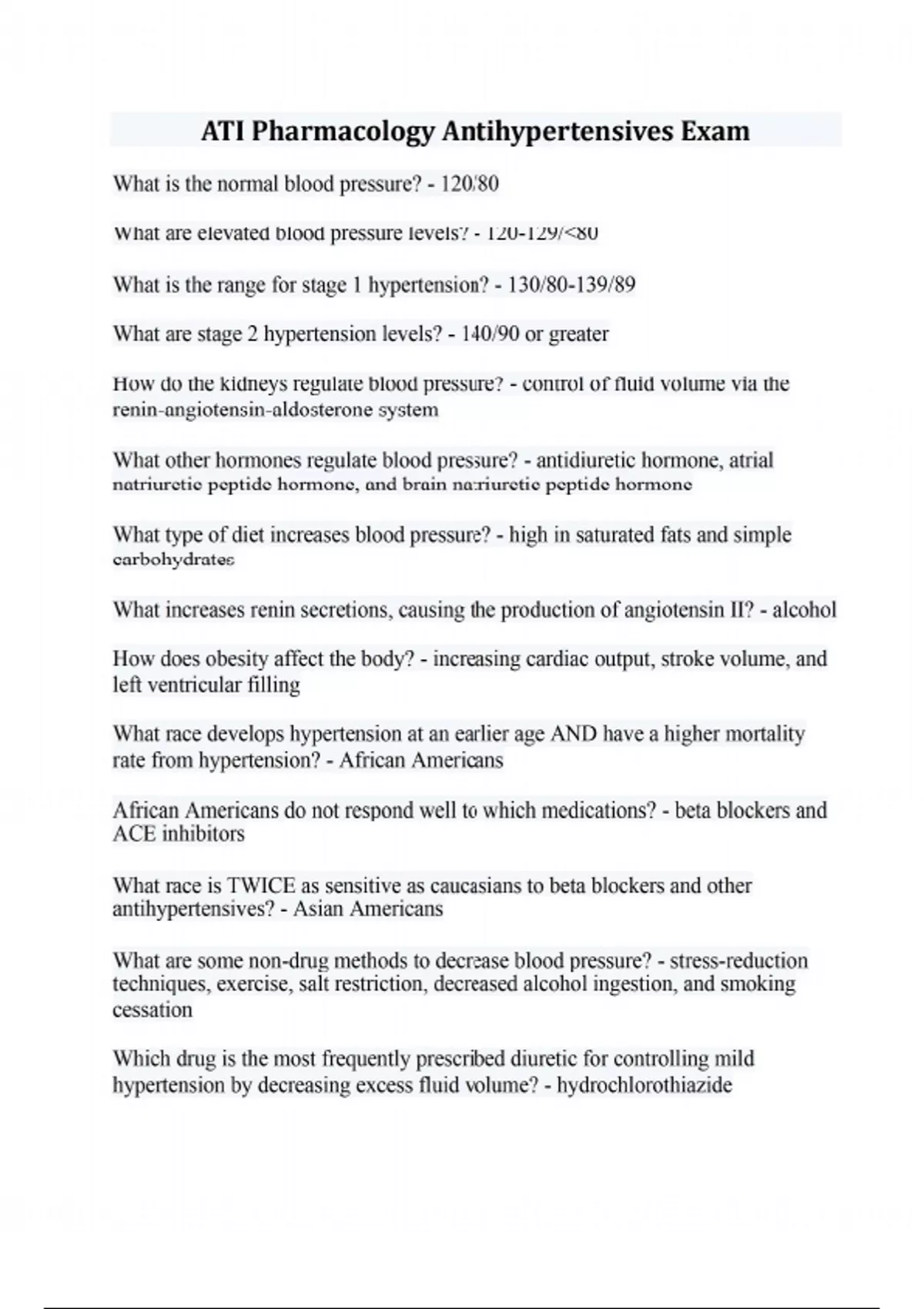 What is the normal blood pressure? - 120/80 What are elevated blood pressure levels? - 120-129/80 What is the range for stage 1 hypertension? - 130/80-139/89 What are stage 2 hypertension levels? - 140/90 or greater How do the kidneys regulate blood pressure? - control of fluid volume via the renin-angiotensin-aldosterone system What other hormones regulate blood pressure? - antidiuretic hormone, atrial natriuretic peptide hormone, and brain natriuretic peptide hormone What type of diet increases blood pressure? - high in saturated fats and simple carbohydrates What increases renin secretions, causing the production of angiotensin II? - alcohol How does obesity affect the body? - increasing cardiac output, stroke volume, and left ventricular filling What race develops hypertension at an earlier age AND have a higher mortality rate from hypertension? - African Americans African Americans do not respond well to which medications? - beta blockers and ACE inhibitors What race is TWICE as sensitive as caucasians to beta blockers and other antihypertensives? - Asian Americans What are some non-drug methods to decrease blood pressure? - stress-reduction techniques, exercise, salt restriction, decreased alcohol ingestion, and smoking cessation Which drug is the most frequently prescribed diuretic for controlling mild hypertension by decreasing excess fluid volume? - hydrochlorothiazide Why are the loop diuretics, like furosemide, usually recommended? - they do not depress renal blood flow Instead of a single thiazide drug, a combination of what two diuretics may be useful? - potassium-sparing and potassium-wasting Propanolol and carvedilol are nonselective beta blockers that inhibit which receptors? - beta 1 and beta 2 receptors What type of beta blockers are preferred for hypertensive patients? - cardioselective (beta 1 only) List examples of drugs that are cardioselective beta blockers? - acebutolol, atenolol, betaxolol, bisoprolol, and metoprolol What are side effects of alpha 2 agonists? - drowsiness, dry mouth, dizziness, and slow heart rate What drug can not be used in patients with impaired liver function? - methyldopa As a nurse, what is one of the most important things you should teach your patient who is on centrally acting alpha2 agonists? - do NOT stop this drug abruptly What are some important nursing interventions for beta blockers? - - monitor BUN/serum creatinine/AST/LDH - advise abrupt discontinuation of antihypertensive drugs - avoid OTC drugs Which drug is an alpha 1 and beta 1 adrenergic blocker that causes vasodilation, which decreases resistance to blood flow? - Labetalol What are some nursing interventions for alpha-adrenergic blockers? - - check daily for fluid retention in extremities and weight gain - advise patients to NOT discontinue drug What are the names of three drugs that are selective alpha-adrenergic blockers? - doxazosin mesylate, prazosin hydrochloride, terazosin hydrochloride What are the names of two direct acting vasodilators that are used for moderate to severe hypertension? - hydralazine hydrochloride (severe), minoxidil (moderate) Which direct acting vasodilator is used for hypertensive emergencies, preeclampsia, and eclampsia? - hydralazine hydrochloride Which direct acting vasodilator is used for hypertension and alopecia? - minoxidil Prazosin hydrochloride is contraindicated in which patients? - -pregnant women - ocular surgery pts - hypersensitivity Excessive hair growth is a side effect of which medication? - minoxidil How do direct-acting vasodilators work? - act by relaxing the smooth muscles of the blood vessels, mainly the arteries, promoting vasodilation What happens when ACE is inhibited? - it inhibits the formation of angiotensin II (vasoconstrictor) and blocks the release of aldosterone What ending do all ACE inhibitor drugs end in? - -pril Name a few ACE inhibitor drugs? - benazepril, captopril, enalapril maleate, fosinopril, lisinopril, moexipril, perindopril, quinapril, ramipril, and trandolapril What race of people do NOT respond well to ACE inhibitors? - African Americans An African American man presents with hypertension. As the nurse, what drug(s) would you expect the doctor to prescribe? - ACE inhibitor WITH a diuretic What is the PRIMARY side effect of ACE inhibitors? - a constant, irritated cough What drug can be substituted for an ACE inhibitor that will NOT have a side effect of coughing? - ARB ACE inhibitors are contraindicated in which patients? - pregnant women What class of drug can you NOT TAKE WITH an ACE inhibitor? - potassiumsparing diuretics (spironolactone) OR salt substitutes that contain potassium