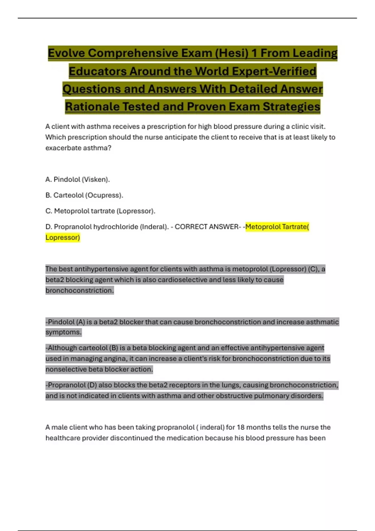 D. Propranolol hydrochloride (Inderal). - CORRECT ANSWER- -Metoprolol Tartrate(