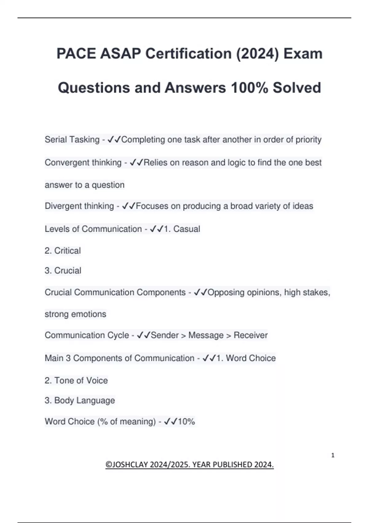 PACE ASAP Certification (2024) Exam Questions and Answers 100% Solved Serial Tasking - Completing one task after another in order of priority Convergent thinking - Relies on reason and logic to find the one best answer to a question Divergent thinking - Focuses on producing a broad variety of ideas Levels of Communication - 1. Casual 2. Critical 3. Crucial Crucial Communication Components - Opposing opinions, high stakes, strong emotions Communication Cycle - Sender > Message > Receiver Main 3 Components of Communication - 1. Word Choice 2. Tone of Voice 3. Body Language Word Choice (% of meaning) - 10%