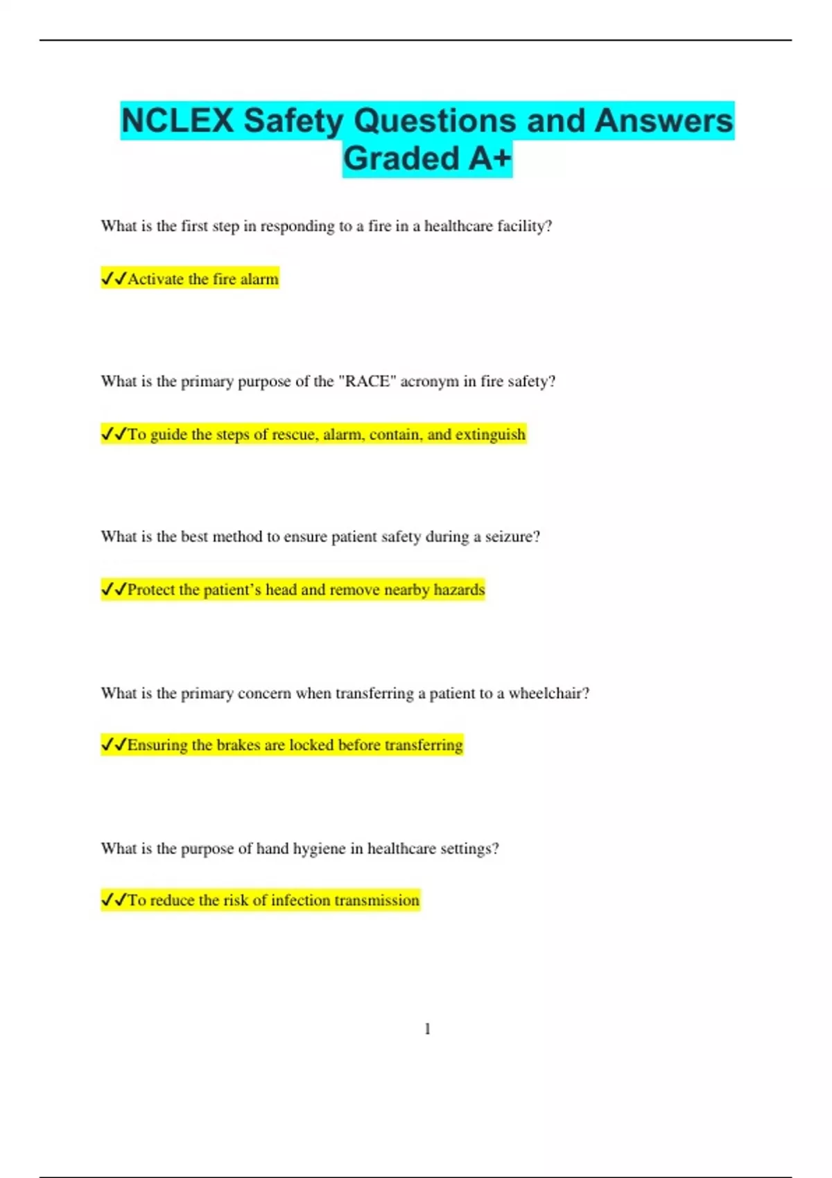 NCLEX Safety Questions and Answers Graded A+ What is the first step in responding to a fire in a healthcare facility? Activate the fire alarm What is the primary purpose of the "RACE" acronym in fire safety? To guide the steps of rescue, alarm, contain, and extinguish What is the best method to ensure patient safety during a seizure? Protect the patient’s head and remove nearby hazards What is the primary concern when transferring a patient to a wheelchair? Ensuring the brakes are locked before transferring What is the purpose of hand hygiene in healthcare settings? To reduce the risk of infection transmission 2 What should a nurse do immediately after a needle stick injury? Wash the area with soap and water and report the incident What is the safest way to identify a patient before administering medication? Use two patient identifiers, such as name and date of birth What should be done if a patient starts to fall while ambulating? Gently lower the patient to the floor while protecting their head What is the appropriate action if a patient refuses medication? Respect the patient’s decision and notify the healthcare provider How should hazardous spills be handled in a healthcare setting? Follow the facility’s spill management protocol and use appropriate PPE What is the nurse’s priority when a patient has a chest tube dislodged? Apply an occlusive dressing to the site and notify the provider 3 What is the first action when a patient’s oxygen saturation drops suddenly? Check the airway and oxygen delivery system What is the correct response if a patient complains of dizziness during ambulation? Assist the patient to sit or lie down immediately How should the nurse handle a patient on fall precautions? Ensure the bed is in the lowest position and use non-slip footwear What should be done if a patient’s IV site shows redness and swelling? Discontinue the IV and assess for signs of infiltration or phlebitis What is the nurse’s first priority in a mass casualty situation? Triage patients to prioritize care based on severity What is the safest way to dispose of a used sharp in a healthcare setting? Place it directly into a designated sharps container 4 What should a nurse do if a medication error is discovered? Report the error immediately and follow the facility’s
