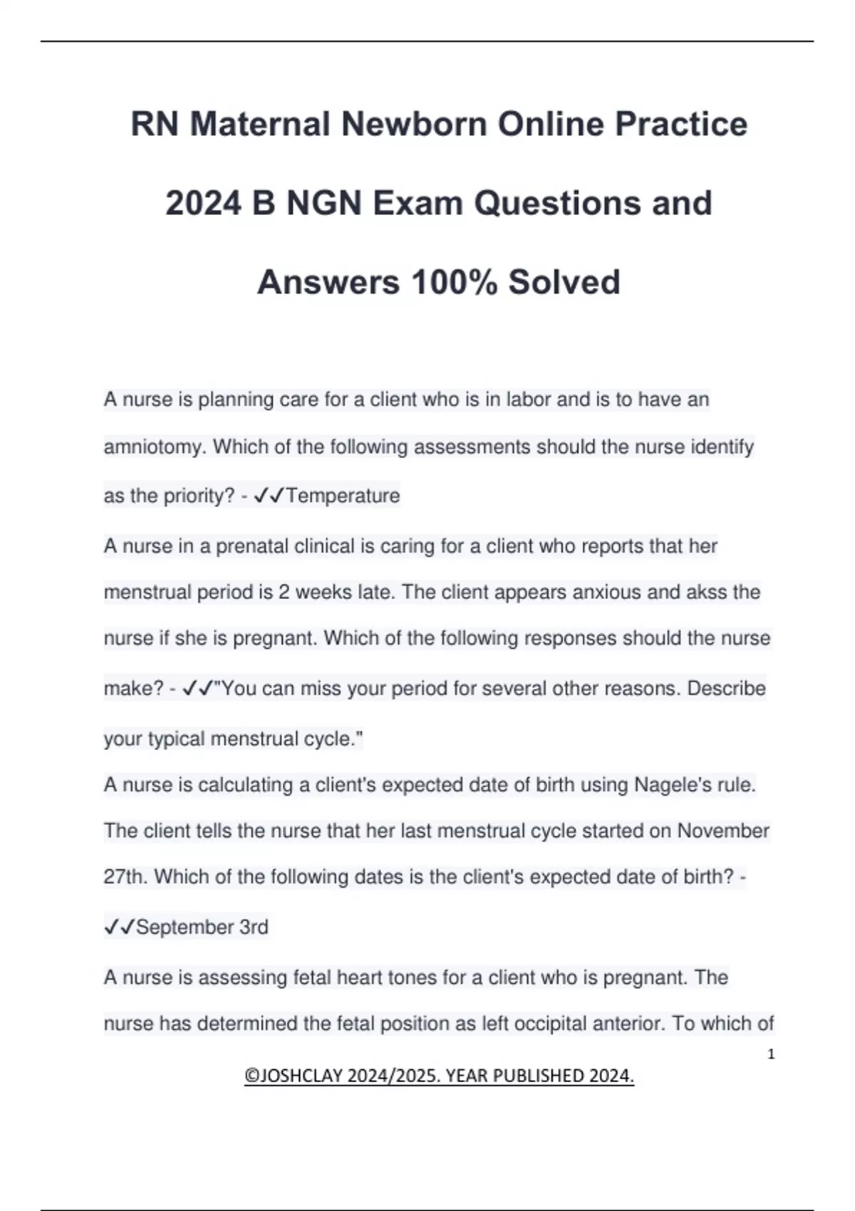 RN Maternal Newborn Online Practice 2024 B NGN Exam Questions and Answers 100% Solved A nurse is planning care for a client who is in labor and is to have an amniotomy. Which of the following assessments should the nurse identify as the priority? - Temperature A nurse in a prenatal clinical is caring for a client who reports that her menstrual period is 2 weeks late. The client appears anxious and akss the nurse if she is pregnant. Which of the following responses should the nurse make? - "You can miss your period for several other reasons. Describe your typical menstrual cycle." A nurse is calculating a client's expected date of birth using Nagele's rule. The client tells the nurse that her last menstrual cycle started on November 27th. Which of the following dates is the client's expected date of birth? - September 3rd A nurse is assessing fetal heart tones for a client who is pregnant. The nurse has determined the fetal position as left occipital anterior. To which of