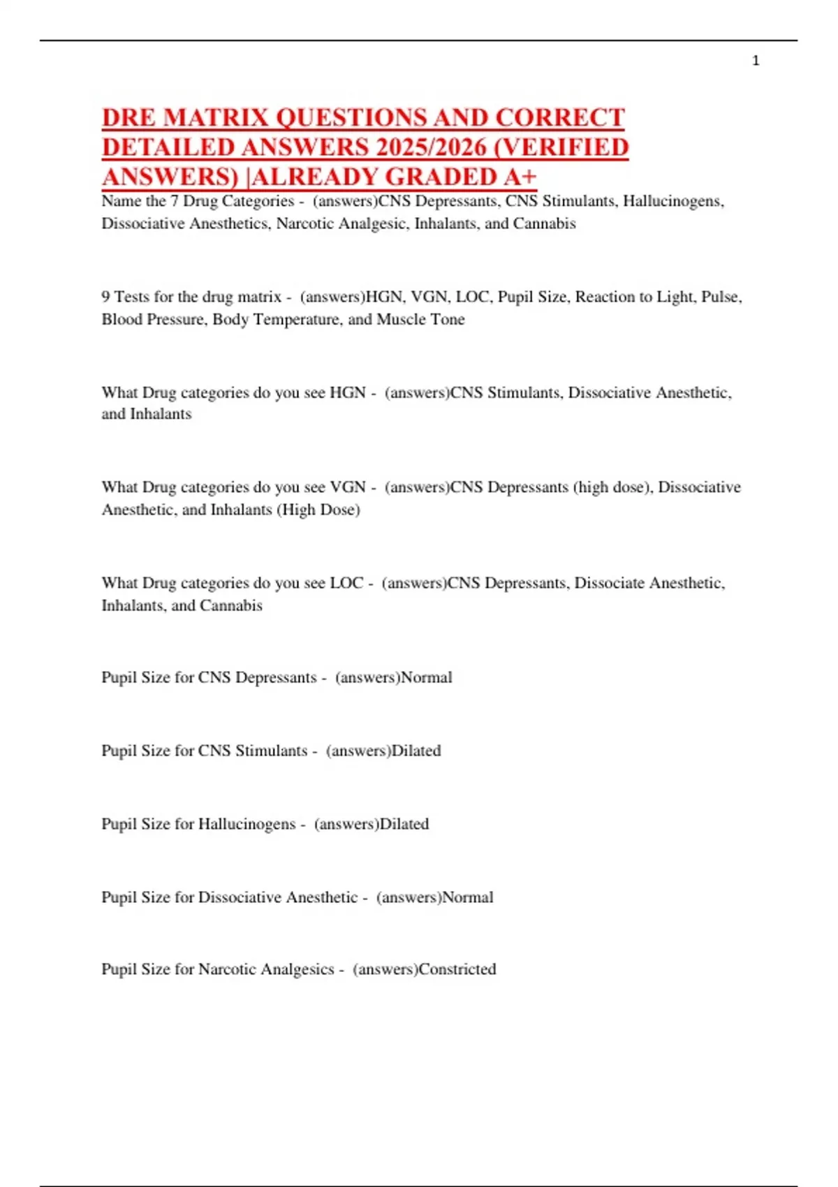 Pupil Size for Hallucinogens - (answers)Dilated