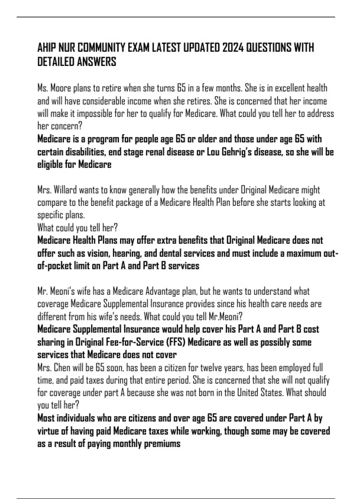AHIP NUR COMMUNITY EXAM LATEST UPDATED 2024 QUESTIONS WITH DETAILED ANSWERS Ms. Moore plans to retire when she turns 65 in a few months. She is in excellent health and will have considerable income when she retires. She is concerned that her income will make it impossible for her to qualify for Medicare. What could you tell her to address her concern? Medicare is a program for people age 65 or older and those under age 65 with certain disabilities, end stage renal disease or Lou Gehrig’s disease, so she will be eligible for Medicare Mrs. Willard wants to know generally how the benefits under Original Medicare might compare to the benefit package of a Medicare Health Plan before she starts looking at specific plans. What could you tell her? Medicare Health Plans may offer extra benefits that Original Medicare does not offer such as vision, hearing, and dental services and must include a maximum outof-pocket limit on Part A and Part B services Mr. Meoni’s wife has a Medicare Advantage plan, but he wants to understand what coverage Medicare Supplemental Insurance provides since his health care needs are different from his wife’s needs. What could you tell Mr.Meoni? Medicare Supplemental Insurance would help cover his Part A and Part B cost sharing in Original Fee-for-Service (FFS) Medicare as well as possibly some services that Medicare does not cover Mrs. Chen will be 65 soon, has been a citizen for twelve years, has been employed full time, and paid taxes during that entire period. She is concerned that she will not qualify for coverage under part A because she was not born in the United States. What should you tell her? Most individuals who are citizens and over age 65 are covered under Part A by virtue of having paid Medicare taxes while working, though some may be covered as a result of paying monthly premiums Mr. Schmidt would like to plan for retirement and has asked you what is covered under Original Fee-for-Service (FFS) Medicare? What could you tell him? Part A, which covers hospital, skilled nursing facility, hospice and home health services and Part B, which covers professional services such as those provided by a doctor are covered under Original Medicare Mr. Lopez has heard that he can sign up for a product called “Medicare Advantage” but is not sure about what type of plan designs are available through this program. What should you tell him about the types of health plans that are available through the Medicare Advantage program? They are Medicare health plans such as HMOs, PPOs, PFFS, SNPs, and MSAs Mr. Wells is trying to understand the difference between Original Medicare and Medicare Advantage. What would be a correct description? Medicare Advantage is a way of covering all of the Original Medicare benefits through private health insurance companies During a sales presentation in Ms. Sullivan’s home, she tells you that she has heard about a type of Medicare health plan known as Private Fee-for-Service (PFFS). She wants to know if this would be available to her. What should you tell her about PFFS plans? A PFFS plan is one of various types of Medicare Advantage plans offered by private entities and she may enroll in one if it is available in her area. Mr. Bauer is 49 years old, but eighteen months ago he was declared disabled by the Social Security Administration and has been receiving disability payments. He is wondering whether he can obtain coverage under Medicare. What should you tell him? After receiving such disability payments for 24 months, he will be automatically enrolled in Medicare, regardless of age Mr. Roberts is concerned that if he signs up for a Medicare Advantage plan, the health plan may, at some time in the future, reduce his benefits below what is available in Original Medicare. What should you tell him about his concern? Medicare health plans must cover all benefits available under Medicare Part A and Part B. Many also cover Part D prescription drugs Mrs. Carol enrolled in the ABC Medicare Advantage (MA) plan several years ago. Her doctor recently confirmed a diagnosis of end-stage renal disease (ESRD). What options does she have in regard to her MA plan during the next open enrollment season? She may remain in her ABC MA plan or enroll in a Special Needs Plan (SNP) for individuals suffering from ESRD if one is available in her area Mrs. Prudence is a widow who will attain age 65 and enroll in Medicare in just a few weeks. She concerned about having prescription drug coverage. Which of the following statements provides the best advice