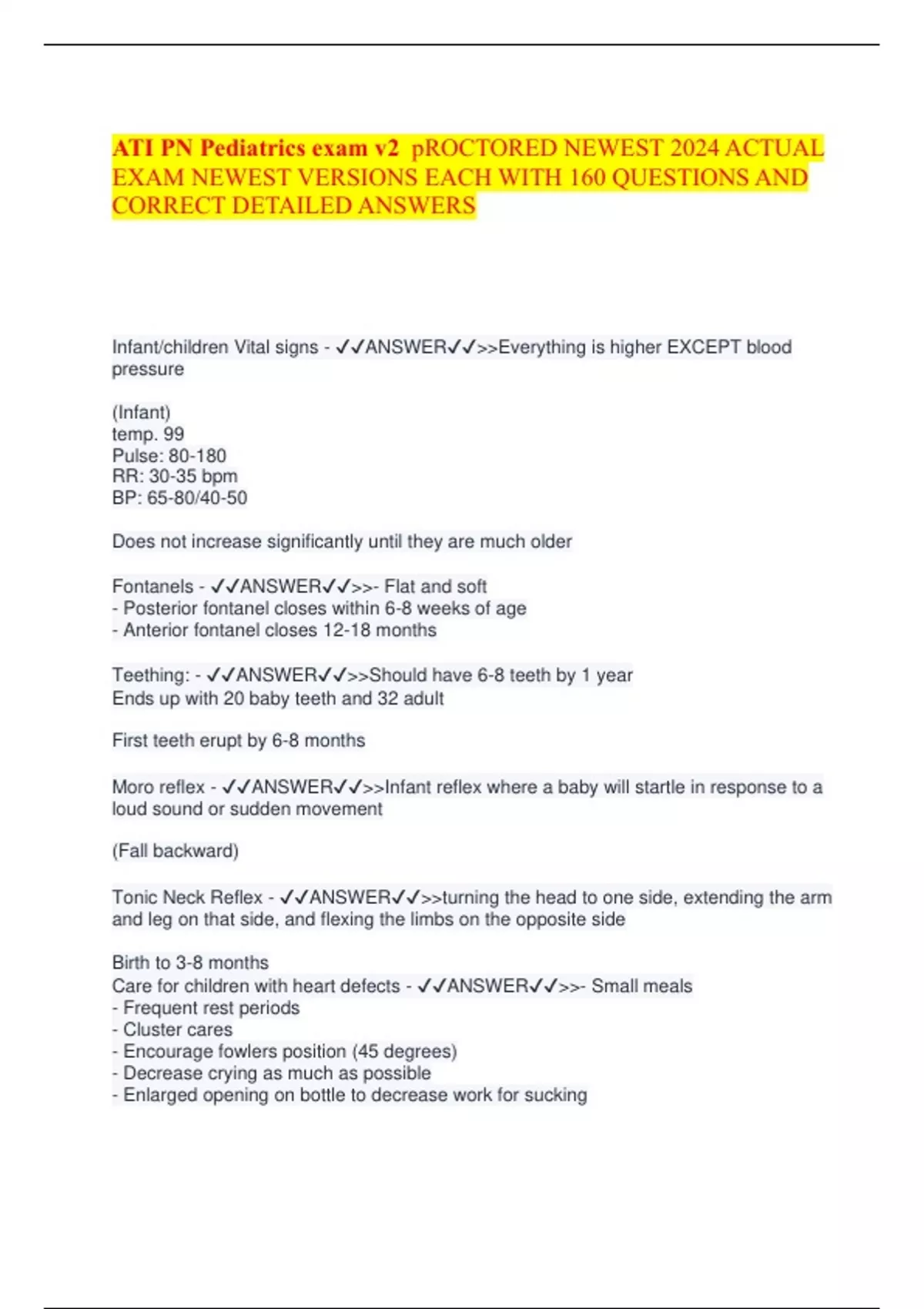 ATI PN Pediatrics exam v2 pROCTORED NEWEST 2024 ACTUAL EXAM NEWEST VERSIONS EACH WITH 160 QUESTIONS AND CORRECT DETAILED ANSWERS Infant/children Vital signs - ANSWER>>Everything is higher EXCEPT blood pressure (Infant) temp. 99 Pulse: 80-180 RR: