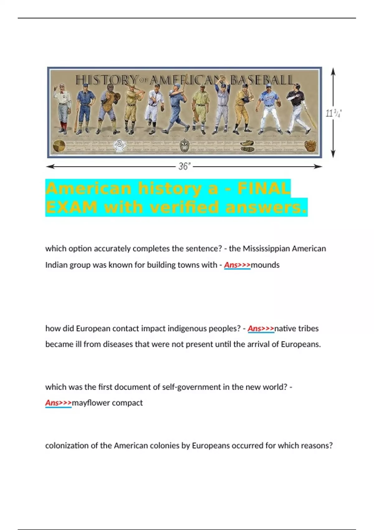 American history a - FINAL EXAM with verified answers. which option accurately completes the sentence? - the Mississippian American Indian group was known for building towns with - Ans>>>mounds how did European contact impact indigenous peoples? - Ans>>>native tribes became ill from diseases that were not present until the arrival of Europeans. which was the first document of self-government in the new world? - Ans>>>mayflower compact