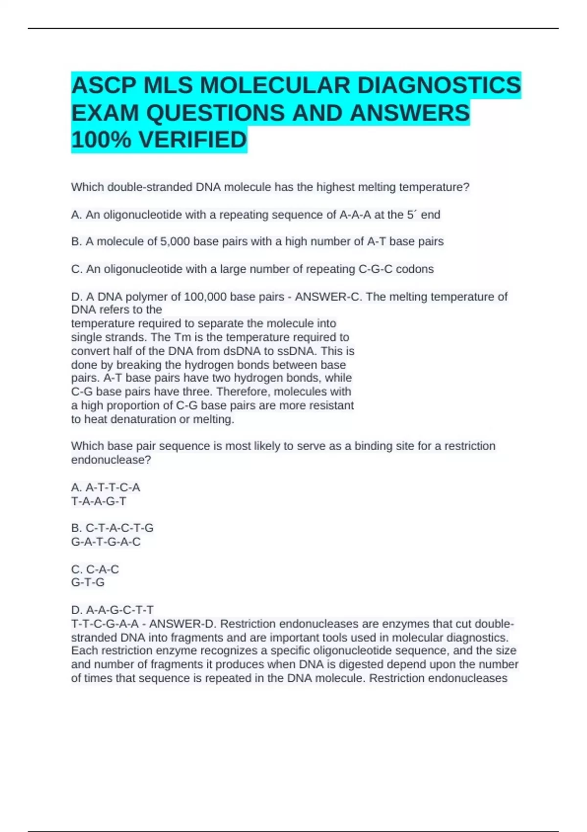 T-T-C-G-A-A - ANSWER-D. Restriction endonucleases are enzymes that cut double-