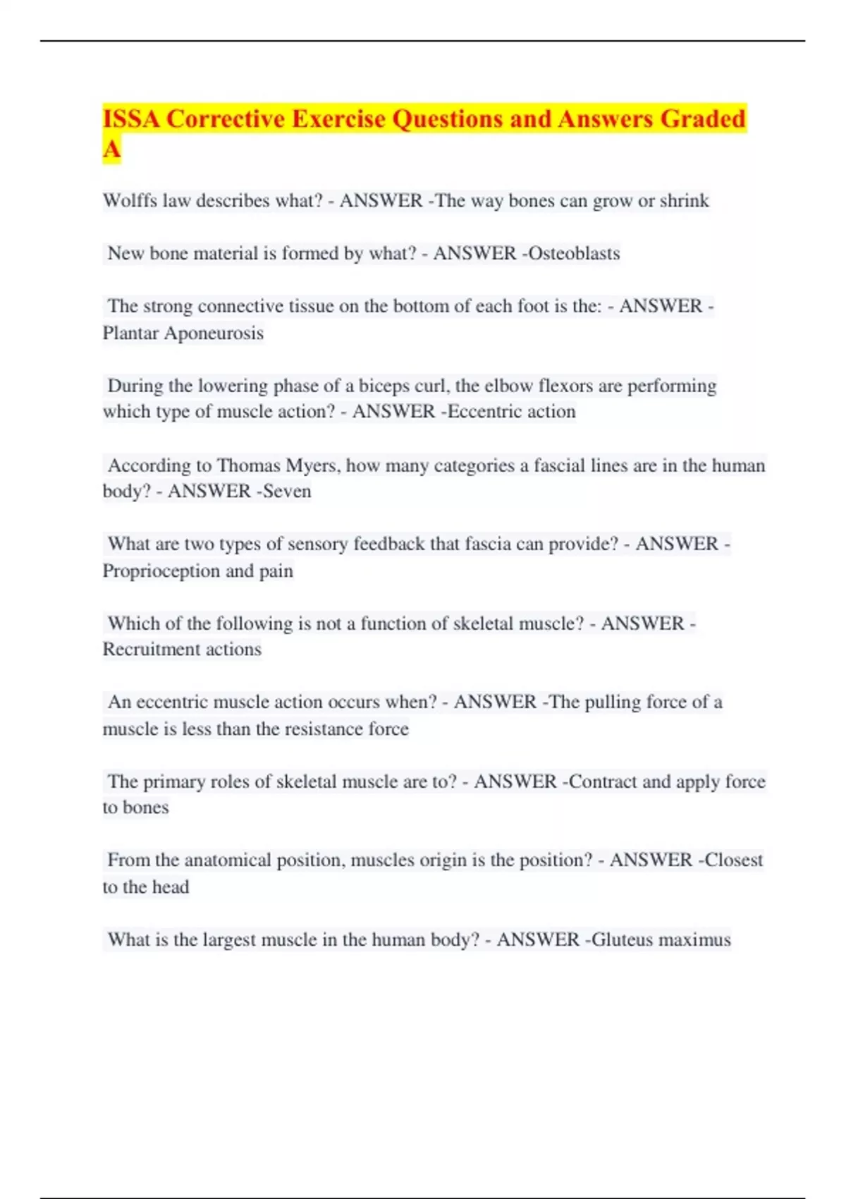 ISSA Corrective Exercise Questions and Answers Graded A Wolffs law describes what? - ANSWER -The way bones can grow or shrink New bone material is formed by what? - ANSWER -Osteoblasts The strong connective tissue on the bottom of each foot is the: - ANSWER - Plantar Aponeurosis During the lowering phase of a biceps curl, the elbow flexors are performing which type of muscle action? - ANSWER -Eccentric action According to Thomas Myers, how many categories a fascial lines are in the human body? - ANSWER -Seven What are two types of sensory feedback that fascia can provide? - ANSWER - Proprioception and pain Which of the following is not a function of skeletal muscle? - ANSWER - Recruitment actions An eccentric muscle action occurs when? - ANSWER -The pulling force of a muscle is less than the resistance force The primary roles of skeletal muscle are to? - ANSWER -Contract and apply force to bones From the anatomical position, muscles origin is the position? - ANSWER -Closest to the head What is the largest muscle in the human body? - ANSWER -Gluteus maximus Which of the following is closest to the estimated number of muscles in the human body? - ANSWER -650 Skeletal muscle is a contractile tissue responsible for? - ANSWER -Voluntary actions and reflex actions Skeletal muscle attaches to bone through a? - ANSWER -Tendon What is the primary connective tissue that forms a tendon? - ANSWER -Type 1 collagen Each bundle of skeletal muscle fibers, covered by a perimysium, is called a? - ANSWER -Fascicle During a biceps curl, the biceps brachii and brachialis muscle act as? - ANSWER -Synergists What is the primary function of a Golgi Tendon Organ - ANSWER -Detect changes in muscle tension Which of the following is not a function required for the coordination of movement? - ANSWER -Motivation What two types of cells make up the nervous system? - ANSWER -Neurons and Glia What is the "transmitter" portion of a neuron that relays a signal? - ANSWER - Axon What is the "integrator" part of a neuron that determines if there's enough information to create an action potential? - ANSWER -Cell Body What is the name of the area, typically between two neurons or a neuron and gland, where electrical or chemical signals are transmitted? - ANSWER -Synapse Which division of the peripheral nervous system is responsible for producing voluntary movements? - ANSWER -Somatic Nervous System What structural component of white matter gives it a whitish appearance? - ANSWER -Myelin Where does the spinal cord end? - ANSWER -L1-L2 Which type of nerve only carries information away from the spinal cord to innervate muscle? - ANSWER -Motor Nerve How many pairs of spinal nerves connect to the spinal cord? - ANSWER -31 What is the name of the cluster of cell bodies, from lower motor neurons, that are contained within the spinal cord? - ANSWER -Motor Neuron Pool Sensory information is carried within: - ANSWER -Ascending tracts What is a primary function of interneurons during movement? - ANSWER - Integrate lower motor neuron activity Descending tracts originate from what two areas of the brain? - ANSWER -Motor cortex and brainstem When a muscle is quickly stretched, which of the following receptors is activated? - ANSWER -Golgi tendon Organ The brain's ability to change its structure and function is known as: - ANSWER - Neuroplasticity Which of the following is not a function of the basal ganglia? - ANSWER -Inhibit lower motor neurons An important component of sleep is to: - ANSWER -Allow CSF to flush out waste