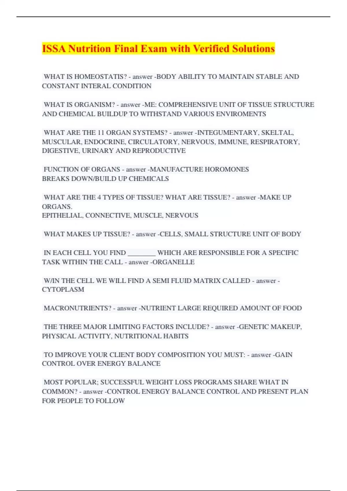 ISSA Nutrition Final Exam with Verified Solutions WHAT IS HOMEOSTATIS? - answer -BODY ABILITY TO MAINTAIN STABLE AND CONSTANT INTERAL CONDITION WHAT IS ORGANISM? - answer -ME: COMPREHENSIVE UNIT OF TISSUE STRUCTURE AND CHEMICAL BUILDUP TO WITHSTAND VARIOUS ENVIROMENTS WHAT ARE THE 11 ORGAN SYSTEMS? - answer -INTEGUMENTARY, SKELTAL, MUSCULAR, ENDOCRINE, CIRCULATORY, NERVOUS, IMMUNE, RESPIRATORY, DIGESTIVE, URINARY AND REPRODUCTIVE FUNCTION OF ORGANS - answer -MANUFACTURE HOROMONES BREAKS DOWN/BUILD UP CHEMICALS WHAT ARE THE 4 TYPES OF TISSUE? WHAT ARE TISSUE? - answer -MAKE UP ORGANS. EPITHELIAL, CONNECTIVE, MUSCLE, NERVOUS WHAT MAKES UP TISSUE? - answer -CELLS, SMALL STRUCTURE UNIT OF BODY IN EACH CELL YOU FIND ________ WHICH ARE RESPONSIBLE FOR A SPECIFIC TASK WITHIN THE CALL - answer -ORGANELLE W/IN THE CELL WE WILL FIND A SEMI FLUID MATRIX CALLED - answer - CYTOPLASM MACRONUTRIENTS? - answer -NUTRIENT LARGE REQUIRED AMOUNT OF FOOD THE THREE MAJOR LIMITING FACTORS INCLUDE? - answer -GENETIC MAKEUP, PHYSICAL ACTIVITY, NUTRITIONAL HABITS TO IMPROVE YOUR CLIENT BODY COMPOSITION YOU MUST: - answer -GAIN CONTROL OVER ENERGY BALANCE MOST POPULAR; SUCCESSFUL WEIGHT LOSS PROGRAMS SHARE WHAT IN COMMON? - answer -CONTROL ENERGY BALANCE CONTROL AND PRESENT PLAN FOR PEOPLE TO FOLLOW VERY HIGH OR VERY LOW CARB DIETS SHOULD BE USED CAUTIOUSLY FOR SHORT PERIODS OF TIME. TRUE OR FALSE - answer -TRUE RESEARCH DEMONSTRATES, THAT PEOPLE ACTUAL AND PERCEIVED NUTRITIONAL INTAKE DIFFER IN WHAT WAY? - answer -PEOPLE EAT FEWER FRUITS AND VEGGIES AND LESS PROTEIN THAN THEY THINK FOODS WITH CALORIE DENSITY CAN INCLUDE? - answer -VEGETABLES FRUITS AND BROTH BASED SOUPS FOOD WITH HIGH NUTRIENT DENSITY AND LOW CALORIE DENSITY ARE REGULARLY OVER CONSUMED AND LEAD TO EXCESS BODY FAT. TRUE OR FALSE - answer -FALSE HEALTHY WEIGHT LOSS REQUIRES WHAT? - answer -BEING IN A NEGATIVE ENERGY BALANCE WHILE PRESERVING LEAN MASS FOCUSING EXCLUSIVELY ON BODY COMPOSITION WHEN MAKEING NUTRITION CHOICES IS ALWAYS HEALTHY? TRUE OR FALSE - answer -FALSE AS A CERTIFIED FITNESS NUTRITONIST, YOU CAN MAKE NUTRITION SUGGESTIONS TO THE FOLLOWING? - answer -HEALTHY ATHLETES AND CLIENTS WHAT ROLES MIGHT YOU HAVE TO FILL AS A CFS - answer -TRIANER, HEALTH INFORMATION PROVIDER, SOCIAL SUPPORT NETWORK METABOLISM REFERS TO: - answer -DIVERSE PHYSIOLOGICAL PROCESSES THAT CONTRIBUTE TO LIFE ORGAN SYSTEM THAT IS RESPONSIBLE FOR PROTECTING US AGAINST PATHOGENS, TUMOR CELLS, AND OTHER FOREIGN INVADERS - answer -IMMUNE ALL OF THE CHEMICAL REACTION THAT TAKE PLACE IN THE BODY REQUIRE THE HELP OF SPECIFIC PROTEINS CALL PHYTOCHEMCIALS. TRUE OR FALSE - answer -FALSE THE DNA CODE IN CELL IS UNIQUE TO US PROVIDES CELLULAR INSTRUCTION FOR WHICH OF THE FOLLOWING: - answer -PROTEINS DUE TO _______________, WE ALL TOLERATE CAFFINE DIFFERENTLY - answer - GENETIC POLYMORPHISMS SINCE PHOSPHOLIPID HELP TO FORM THE PLASMA MEMBRANE THE TYPES OF __________ WE CONSUME IN OUR DIET WILL INFLUENCE THE MEMBRANES FLUIDITY - answer -FATS WHAT HIGHLY ORGANIZED CELLULAR ORGANELLES ARE RESPONSIBLE FOR CONVERTING THINGS LIKE PROTEINS, CARB FAT INTO ENERGY? - answer - MITCHONDRIA DNA ULTIMATELY DETERMINES EVERYTHING FROM HOW THE BODY DEVELOPS, REPAIR ITSELF, TRANSPORTS CHEMICALS INTRODUCED INTO CIRCULATION? TRUE OR FALSE - answer -TRUE ONCE OUR DNA SENDS OUT A SIGNAL TO MAKE PROTEINS, IT IS THE JOB OF THE ___________________ TO RECEIVE THIS GENETIC MESSAGE FROM THE DNA AND TO MAKE AND TRANSPORTS THE REQUIRED PROTEINS FOR USE INSIDE AND OUTSIDE OF THE CELL - answer -ENDOPLASMIC RETICULUM AND GOLGI APPARATUS AN EXAMPLE OF A PROTEIN RECEPTOR INITIATING A SIGNAL TRANSDUCTION CASCADE - answer -CELLULAR RESPONSE TO INSULIN LIPASE IS AN EXAMPLE OF _________ THAT DEGRADES __________ - answer - ENZYME AND LIPIDS ENZYMATIC FUNCTION IS INFLUENCED BY A HOST OF ENVIRONMENTAL AND GENETIC, NUTRITIONAL FACTORS INCLUDING WHICH OF THE FOLLOWING? - answer -TEMPERATURE, PH VITAMIN AND MINERAL STATUS THE GI TRACT IS _________ FEET - answer -25 SALIVIA HAS TWO DIGESTIVE ENZYMES: - answer -AMYLASE: CATALYZE THE HYDROLSIS OF STARCH LIPASE: SPLITTING OF FATS THE STOMACH FUNCTION IS TO - answer -RELEASE ACID AND BREAK DOWN FOOD INTO CHYME