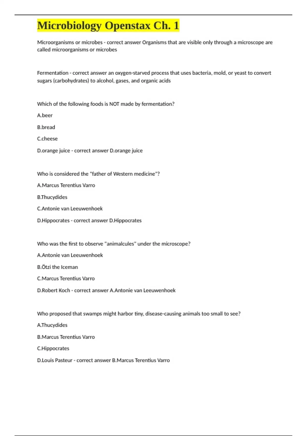 Microorganisms or microbes - correct answer Organisms that are visible only through a microscope are called microorganisms or microbes Fermentation - correct answer an oxygen-starved process that uses bacteria, mold, or yeast to convert sugars (carbohydrates) to alcohol, gases, and organic acids Which of the following foods is NOT made by fermentation? A.beer B.bread C.cheese D.orange juice - correct answer D.orange juice Who is considered the "father of Western medicine"? A.Marcus Terentius Varro B.Thucydides C.Antonie van Leeuwenhoek D.Hippocrates - correct answer D.Hippocrates Who was the first to observe "animalcules" under the microscope? A.Antonie van Leeuwenhoek B.Ötzi the Iceman C.Marcus Terentius Varro D.Robert Koch - correct answer A.Antonie van Leeuwenhoek Who proposed that swamps might harbor tiny, disease-causing animals too small to see? A.Thucydides B.Marcus Terentius Varro C.Hippocrates D.Louis Pasteur - correct answer B.Marcus Terentius Varro