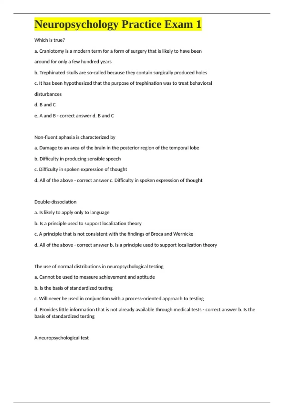 Which is true? a. Craniotomy is a modern term for a form of surgery that is likely to have been around for only a few hundred years b. Trephinated skulls are so-called because they contain surgically produced holes c. It has been hypothesized that the purpose of trephination was to treat behavioral disturbances d. B and C e. A and B - correct answer d. B and C Non-fluent aphasia is characterized by a. Damage to an area of the brain in the posterior region of the temporal lobe b. Difficulty in producing sensible speech c. Difficulty in spoken expression of thought d. All of the above - correct answer c. Difficulty in spoken expression of thought Double-dissociation a. Is likely to apply only to language b. Is a principle used to support localization theory c. A principle that is not consistent with the findings of Broca and Wernicke d. All of the above - correct answer b. Is a principle used to support localization theory The use of normal distributions in neuropsychological testing a. Cannot be used to measure achievement and aptitude b. Is the basis of standardized testing c. Will never be used in conjunction with a process-oriented approach to testing d. Provides little information that is not already available through medical tests - correct answer b. Is the basis of standardized testing A neuropsychological test