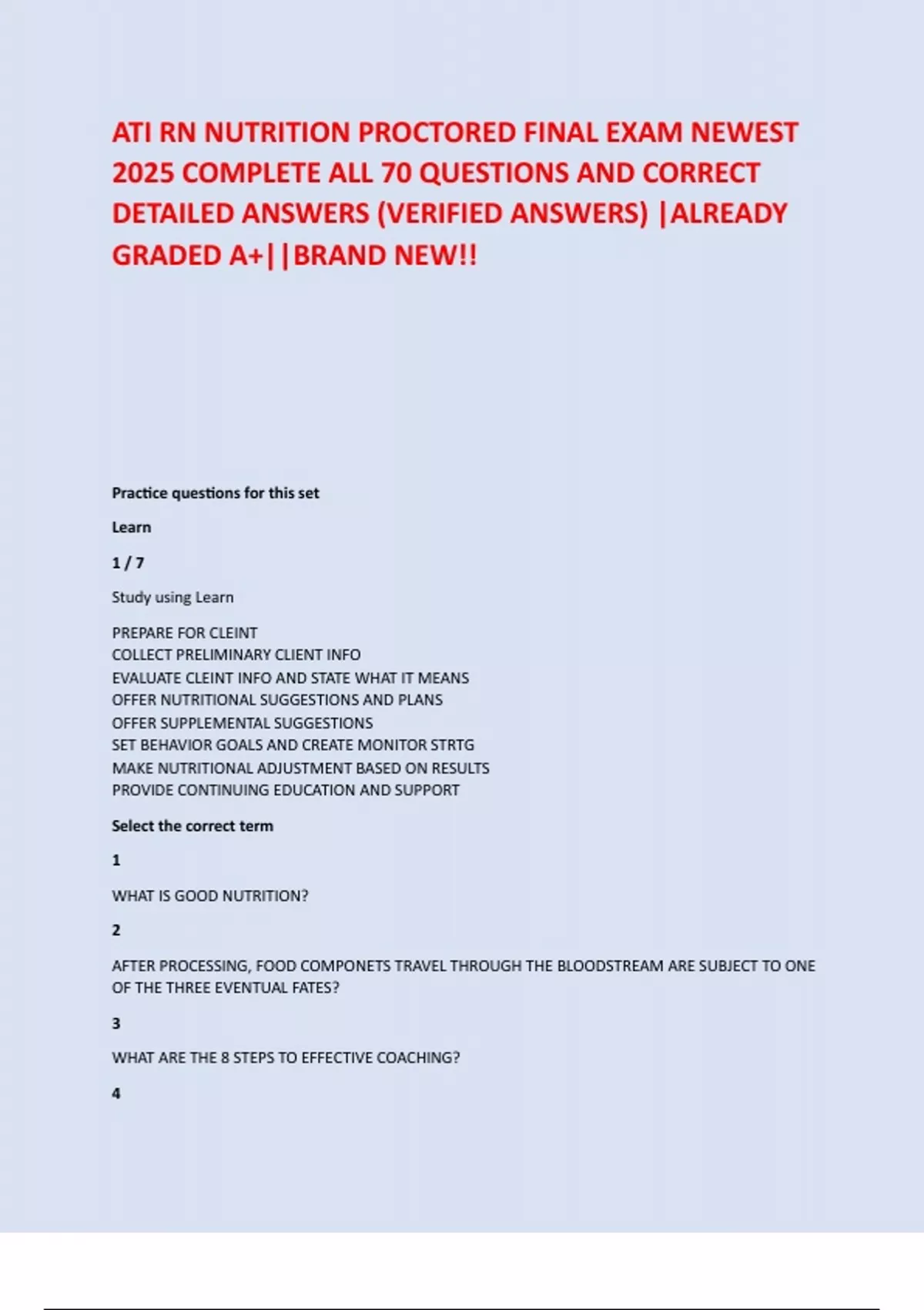 ATI RN NUTRITION PROCTORED FINAL EXAM NEWEST 2025 COMPLETE ALL 70 QUESTIONS AND CORRECT DETAILED ANSWERS (VERIFIED ANSWERS) |ALREADY GRADED A+||BRAND NEW!!