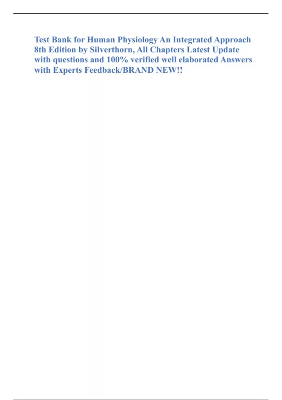 Test Bank for Human Physiology An Integrated Approach 8th Edition by Silverthorn, All Chapters Latest Update with questions and 100% verified well elaborated Answers with Experts Feedback/BRAND NEW!! 1) Functions of the kidneys include all but one of the following. Identify the exception. A) regulation of extracellular fluid volume B) maintenance of ion balance in body fluids C) regulation of blood protein levels D) regulation of blood osmolarity E) homeostatic regulation of blood pH - ANSWER-: C Section Title: Functions of the Kidneys Learning Outcome: 19.1 : Level I: Reviewing Facts and Terms (Bloom's Taxonomy: Knowledge) 2) Ions directly regulated by the kidney include all EXCEPT which of the following? A) Na+ B) K+ C) Ca2+ D) HCO3- E) OH- - ANSWER-: E Section Title: Functions of the Kidneys Learning Outcome: 19.1 : Level I: Reviewing Facts and Terms (Bloom's Taxonomy: Knowledge)