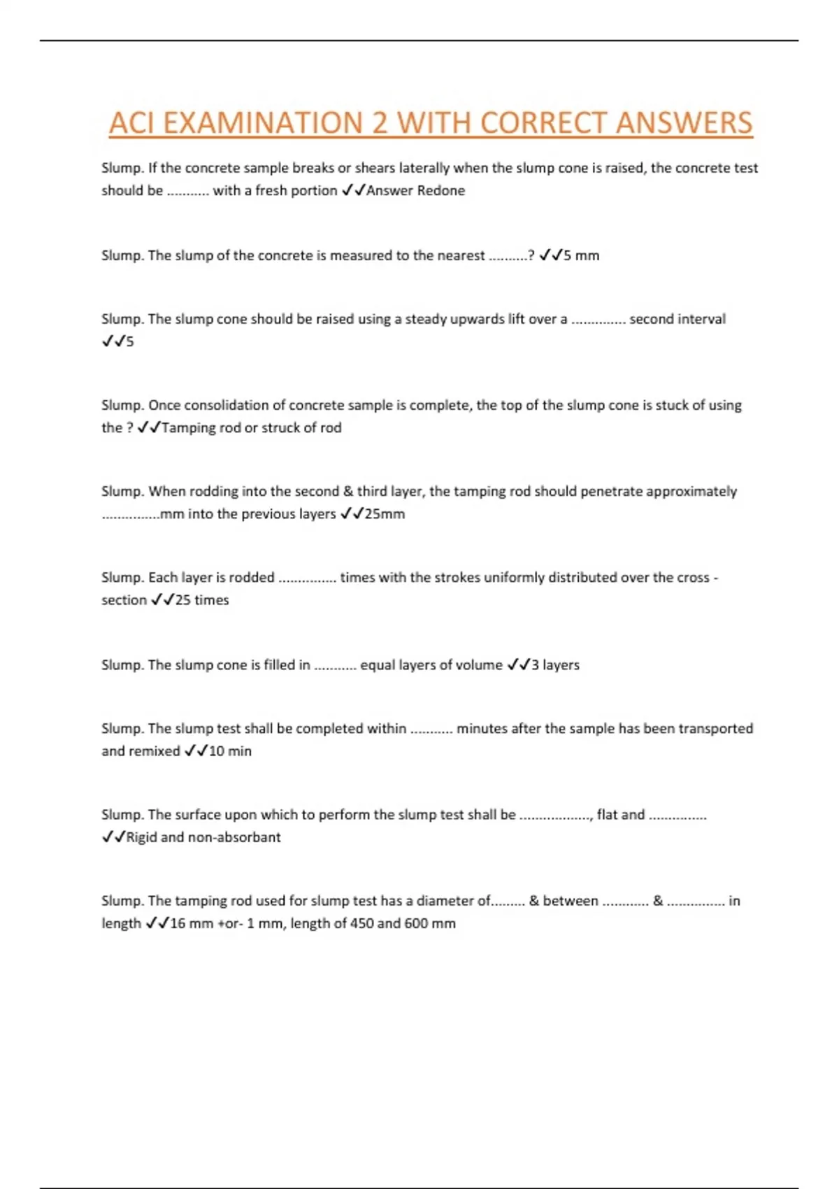 ACI EXAMINATION 2 WITH CORRECT ANSWERS Slump. If the concrete sample breaks or shears laterally when the slump cone is raised, the concrete test should be ........... with a fresh portion Answer Redone Slump. The slump of the concrete is measured to the nearest ..........? 5 mm Slump. The slump cone should be raised using a steady upwards lift over a .............. second interval 5 Slump. Once consolidation of concrete sample is complete, the top of the slump cone is stuck of using the ? Tamping rod or struck of rod