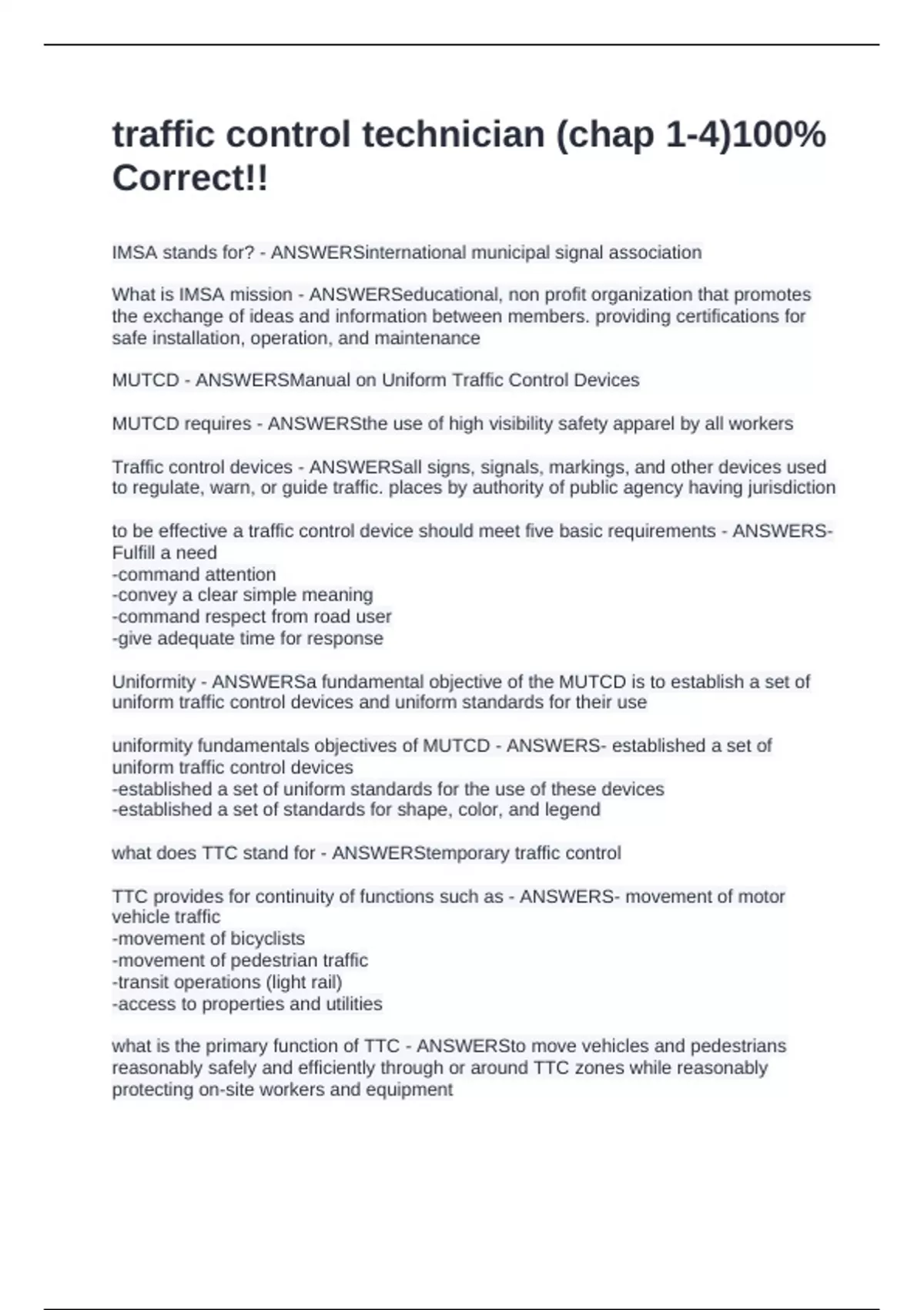 IMSA stands for? - ANSWERSinternational municipal signal association What is IMSA mission - ANSWERSeducational, non profit organization that promotes the exchange of ideas and information between members. providing certifications for safe installation, operation, and maintenance MUTCD - ANSWERSManual on Uniform Traffic Control Devices MUTCD requires - ANSWERSthe use of high visibility safety apparel by all workers Traffic control devices - ANSWERSall signs, signals, markings, and other devices used to regulate, warn, or guide traffic. places by authority of public agency having jurisdiction to be effective a traffic control device should meet five basic requirements - ANSWERS-Fulfill a need -command attention -convey a clear simple meaning -command respect from road user -give adequate time for response Uniformity - ANSWERSa fundamental objective of the MUTCD is to establish a set of uniform traffic control devices and uniform standards for their use uniformity fundamentals objectives of MUTCD - ANSWERS- established a set of uniform traffic control devices -established a set of uniform standards for the use of these devices -established a set of standards for shape, color, and legend what does TTC stand for - ANSWERStemporary traffic control TTC provides for continuity of functions such as - ANSWERS- movement of motor vehicle traffic -movement of bicyclists -movement of pedestrian traffic -transit operations (light rail) -access to properties and utilities what is the primary function of TTC - ANSWERSto move vehicles and pedestrians