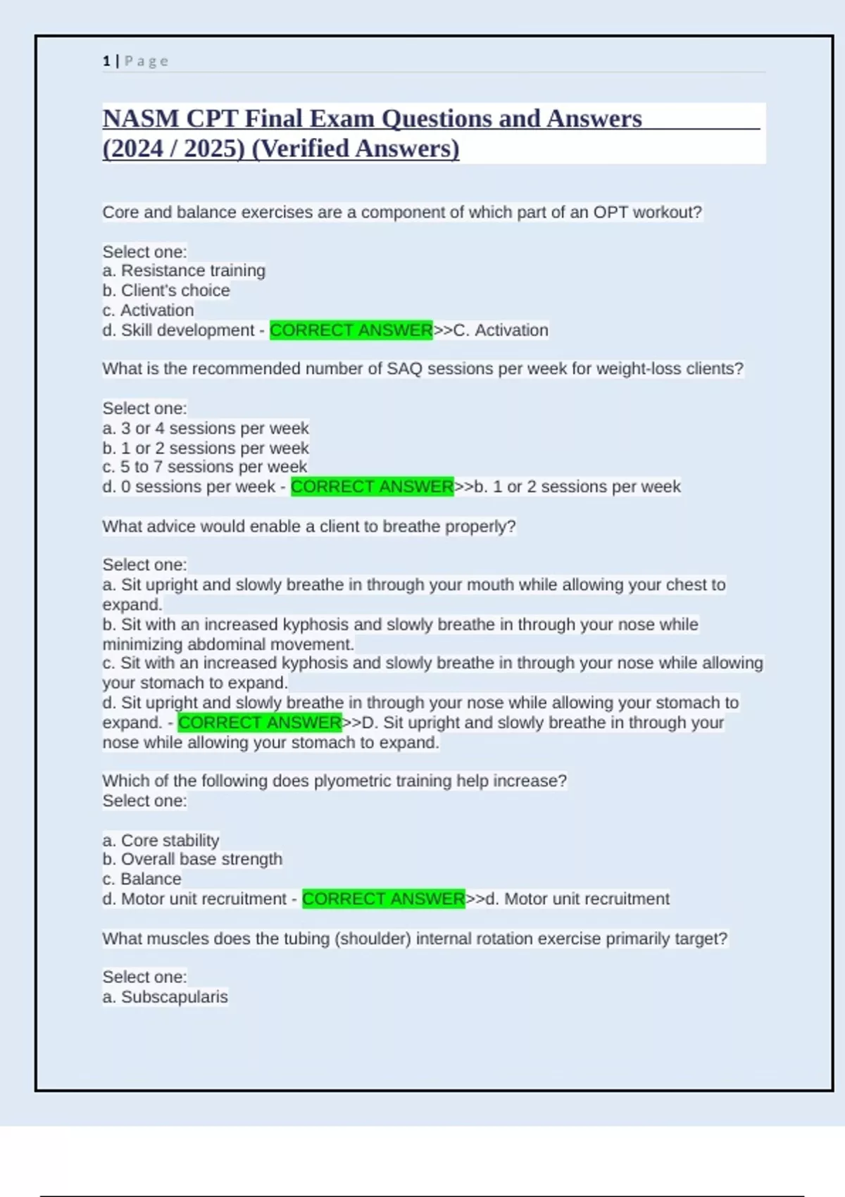 NASM CPT Final Exam Questions and Answers (2024/2025)Verified Answers
