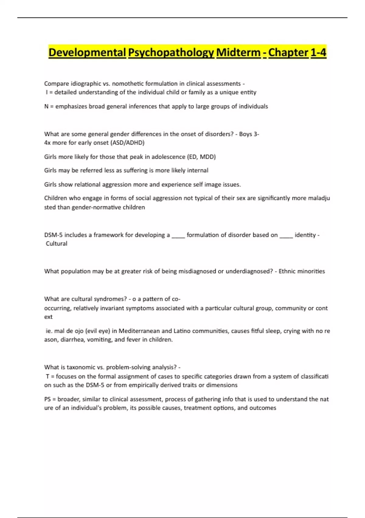 DevelopmentalVPsychopathologyVMidtermV-VChapterV1-4 CompareVidiographicVvs.VnomotheƟcVformulaƟonVinVclinicalVassessmentsVVIV=VdetailedVunderstandingVofVtheVindividualVchildVorVfamilyVasVaVuniqueVenƟty NV=VemphasizesVbroadVgeneralVinferencesVthatVapplyVtoVlargeVgroupsVofVindividuals WhatVareVsomeVgeneralVgenderVdifferencesVinVtheVonsetVofVdisorders?V-VBoysV3- 4xVmoreVforVearlyVonsetV(ASD/ADHD) GirlsVmoreVlikelyVforVthoseVthatVpeakVinVadolescenceV(ED,VMDD) GirlsVmayVbeVreferredVlessVasVsufferingVisVmoreVlikelyVinternal GirlsVshowVrelaƟonalVaggressionVmoreVandVexperienceVselfVimageVissues. ChildrenVwhoVengageVinVformsVofVsocialVaggressionVnotVtypicalVofVtheirVsexVareVsignificantlyVmoreVmaladju stedVthanVgender-normaƟveVchildren DSM-5VincludesVaVframeworkVforVdevelopingVaV____VformulaƟonVofVdisorderVbasedVonV____VidenƟtyVVCultural WhatVpopulaƟonVmayVbeVatVgreaterVriskVofVbeingVmisdiagnosedVorVunderdiagnosed?V-VEthnicVminoriƟes WhatVareVculturalVsyndromes?V-VoVaVpaƩernVofVcooccurring,VrelaƟvelyVinvariantVsymptomsVassociatedVwithVaVparƟcularVculturalVgroup,VcommunityVorVcont ext Vie.VmalVdeVojoV(evilVeye)VinVMediterraneanVandVLaƟnoVcommuniƟes,VcausesVfiƞulVsleep,VcryingVwithVnoVre ason,Vdiarrhea,VvomiƟng,VandVfeverVinVchildren. WhatVisVtaxonomicVvs.Vproblem-solvingVanalysis?VVTV=VfocusesVonVtheVformalVassignmentVofVcasesVtoVspecificVcategoriesVdrawnVfromVaVsystemVofVclassificaƟ onVsuchVasVtheVDSM-5VorVfromVempiricallyVderivedVtraitsVorVdimensions PSV=Vbroader,VsimilarVtoVclinicalVassessment,VprocessVofVgatheringVinfoVthatVisVusedVtoVunderstandVtheVnat ureVofVanVindividual'sVproblem,VitsVpossibleVcauses,VtreatmentVopƟons,VandVoutcomes