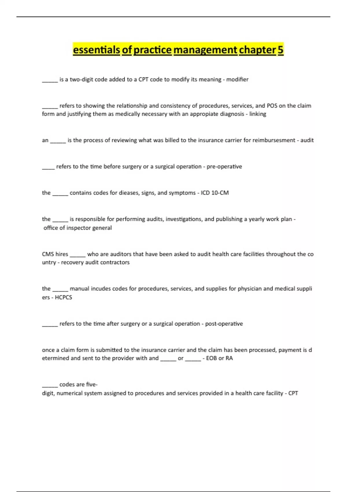 essenƟalsRofRpracƟceRmanagementRchapterR5 _____RisRaRtwo-digitRcodeRaddedRtoRaRCPTRcodeRtoRmodifyRitsRmeaningR-Rmodifier _____RrefersRtoRshowingRtheRrelaƟonshipRandRconsistencyRofRprocedures,Rservices,RandRPOSRonRtheRclaimR formRandRjusƟfyingRthemRasRmedicallyRnecessaryRwithRanRappropiateRdiagnosisR-Rlinking anR_____RisRtheRprocessRofRreviewingRwhatRwasRbilledRtoRtheRinsuranceRcarrierRforRreimbursesmentR-Raudit ____RrefersRtoRtheRƟmeRbeforeRsurgeryRorRaRsurgicalRoperaƟonR-Rpre-operaƟve theR_____RcontainsRcodesRforRdieases,Rsigns,RandRsymptomsR-RICDR10-CM theR_____RisRresponsibleRforRperformingRaudits,RinvesƟgaƟons,RandRpublishingRaRyearlyRworkRplanRRofficeRofRinspectorRgeneral CMSRhiresR_____RwhoRareRauditorsRthatRhaveRbeenRaskedRtoRauditRhealthRcareRfaciliƟesRthroughoutRtheRco untryR-RrecoveryRauditRcontractors theR_____RmanualRincudesRcodesRforRprocedures,Rservices,RandRsuppliesRforRphysicianRandRmedicalRsuppli ersR-RHCPCS