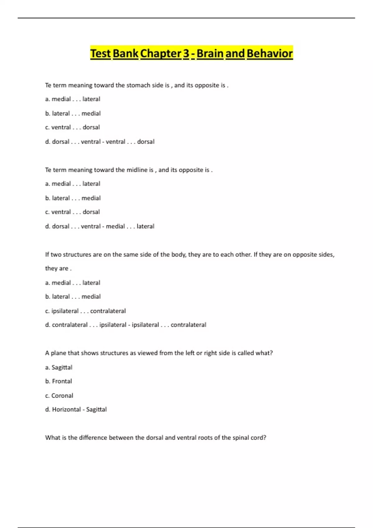 TesthBankhChapterh3h-hBrainhandhBehavior Tehtermhmeaninghtowardhthehstomachhsidehish,handhitshoppositehish. ral al al al Tehtermhmeaninghtowardhthehmidlinehish,handhitshoppositehish. ral al al ral Ifhtwohstructuresharehonhthehsamehsidehofhthehbody,htheyharehtoheachhother.hIfhtheyharehonhoppositehsides, theyhareh. ral al ralateral ralateral AhplanehthathshowshstructureshashviewedhfromhthehleŌhorhrighthsidehishcalledhwhat? a.hSagiƩal b.hFrontal c.hCoronal d.hHorizontalh-hSagiƩal