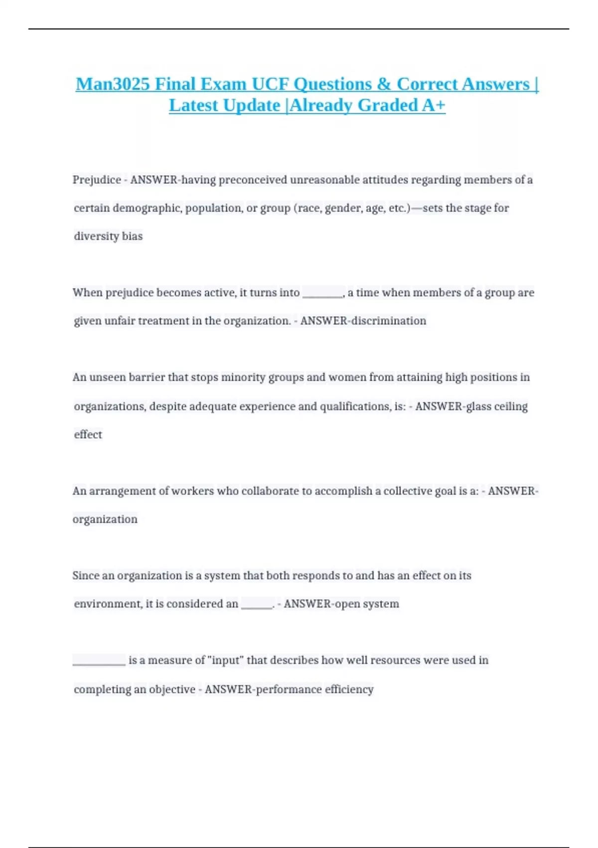 Man3025 Final Exam UCF Questions & Correct Answers | Latest Update |Already Graded A+