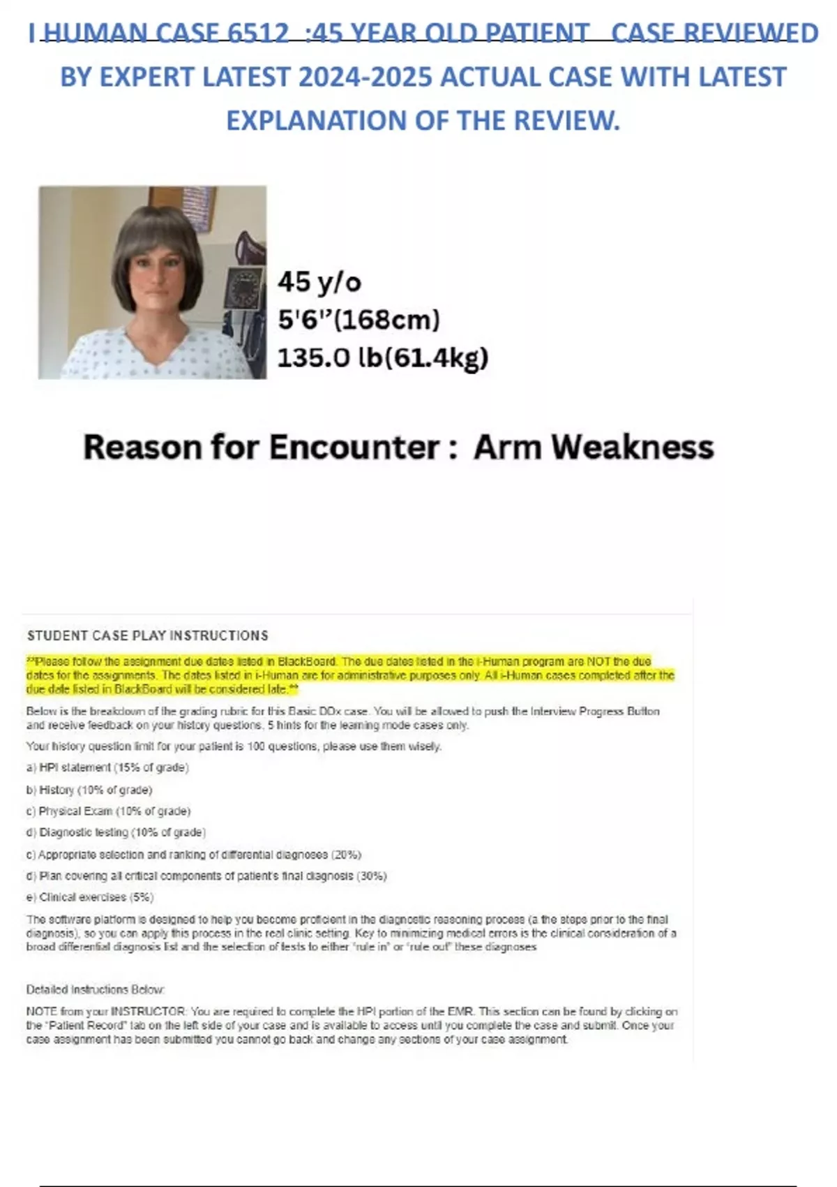 I HUMAN CASE 6512 :45 YEAR OLD PATIENT REASON FOR ENCOUNTER ARM WEAKNESS CASE REVIEWED BY EXPERT LATEST ACTUAL CASE WITH LATEST EXPLANATION OF THE REVIEW.