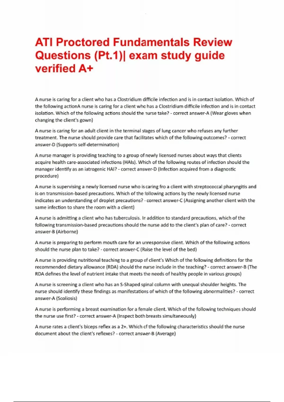 ATI Proctored Fundamentals Review Questions (Pt.1)| exam study guide verified A+ATI Proctored Fundamentals Review Questions (Pt.1)| exam study guide verified A+ A nurse is caring for a client who has a Clostridium difficile infection and is in contact isolation. Which of the following actionA nurse is caring for a client who has a Clostridium difficile infection and is in contact isolation. Which of the following actions should the nurse take? - correct answer-A (Wear gloves when changing the client's gown) A nurse is caring for an adult client in the terminal stages of lung cancer who refuses any further treatment. The nurse should provide care that facilitates which of the following outcomes? - correct answer-D (Supports self-determination) A nurse manager is providing teaching to a group of newly licensed nurses about ways that clients acquire health care-associated infections (HAIs). Which of the following routes of infection should the manager identify as an iatrogenic HAI? - correct answer-D (Infection acquired from a diagnostic procedure) A nurse is supervising a newly licensed nurse who is caring fro a client with streptococcal pharyngitis and is on transmission-based precautions. Which of the following actions by the newly licensed nurse indicates an understanding of droplet precautions? - correct answer-C (Assigning another client with the same infection to share the room with a client) A nurse is admitting a client who has tuberculosis. In addition to standard precautions, which of the following transmission-based precautions should the nurse add to the client's plan of care? - correct answer-B (Airborne) A nurse is preparing to perform mouth care for an unresponsive client. Which of the following actions should the nurse plan to take? - correct answer-C (Raise the level of the bed) A nurse is providing nutritional teaching to a group of client's Which of the following definitions for the recommended dietary allowance (RDA) should the nurse include in the teaching? - correct answer-B (The RDA defines the level of nutrient intake that meets the needs of healthy people in various groups) A nurse is screening a client who has an S-Shaped spinal column with unequal shoulder heights. The nurse should identify these findings as manifestations of which of the following abnormalities? - correct answer-A (Scoliosis) A nurse is performing a breast examination for a female client. Which of the following techniques should the nurse use first? - correct answer-A (Inspect both breasts simultaneously) A nurse rates a client's biceps reflex as a 2+. Which of the following characteristics should the nurse document about the client's reflexes? - correct answer-B (Average) A nurse is teaching a client about lifestyle changes to manage a chronic illness. Which of the following strategies should the nurse use first to help the client make a commitment to these lifestyle changes? - correct answer-D (Help the client identify ways that these changes will result in positive personal outcomes) A nurse is teaching a group of young adults. Which of the following should the nurse identify as an expected development task for this age group? - correct answer-A (Independent moral development) A middle aged adult client is discussing future plans with the nurse. Which of the following statements should the nurse identify as an indication that the client is having difficulty achieving Erikson's developmental task for the age group? - correct answer-A (We miss our daughter so much that we are going to move closer to her.) A nurse is teaching a middle-aged female client about disease prevention and health maintenance. Which of the following diagnostic tests should the nurse recommend as part of this client's routine health screening? - correct answer-C (Eye examination every 2 years) A nurse is teaching a middle-aged adult client about health promotion