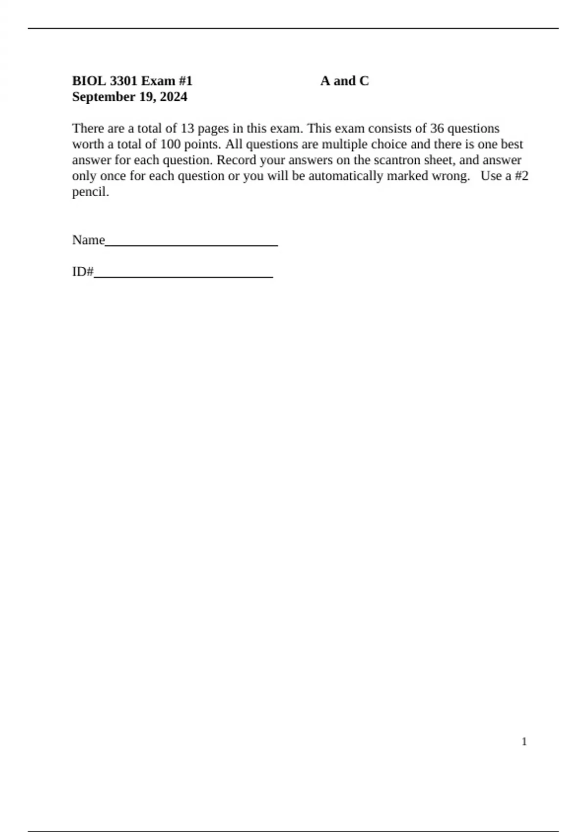 BIOL 3301 Exam 1|Consists of 36 Questions with Correct Answers|100 Points Awarded.