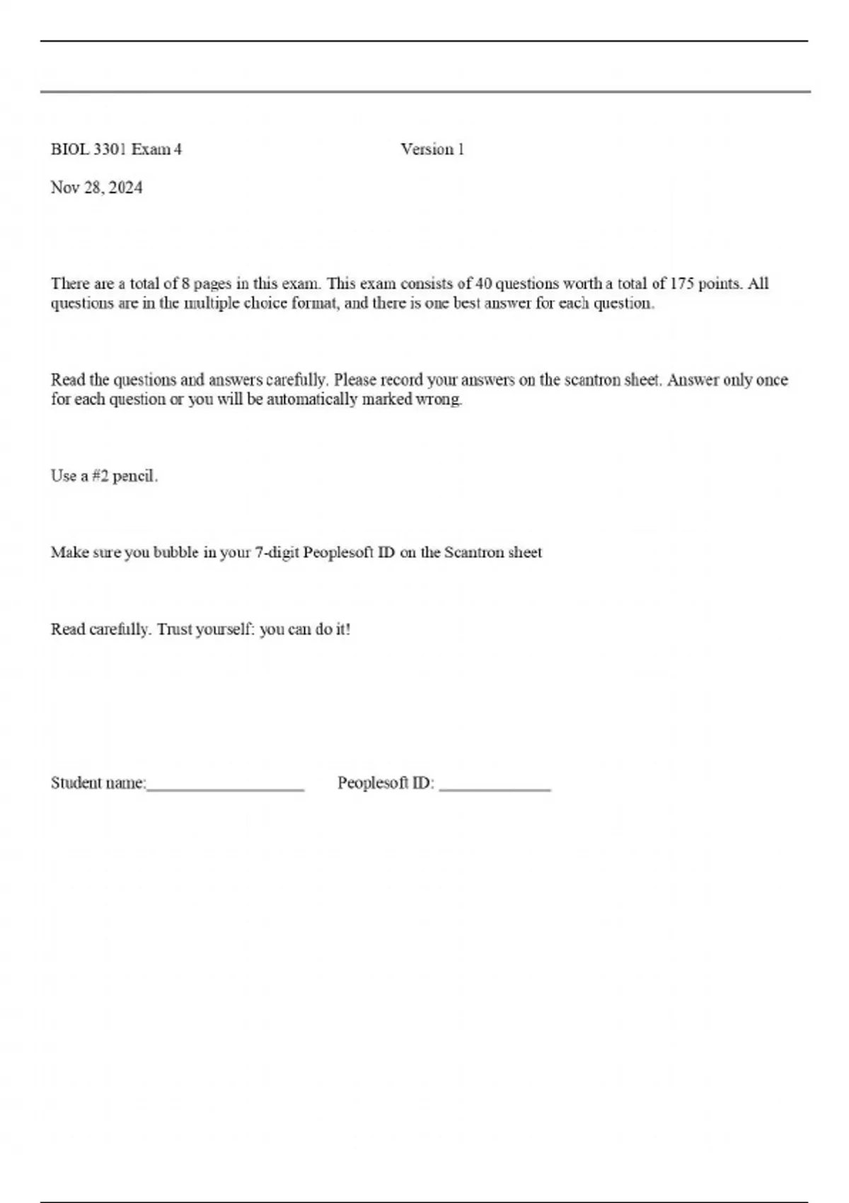 BIOL 3301 Exam 4 Version 1 with 40 Questions and All Correct Answers in Yellow|Latest Update with complete solution