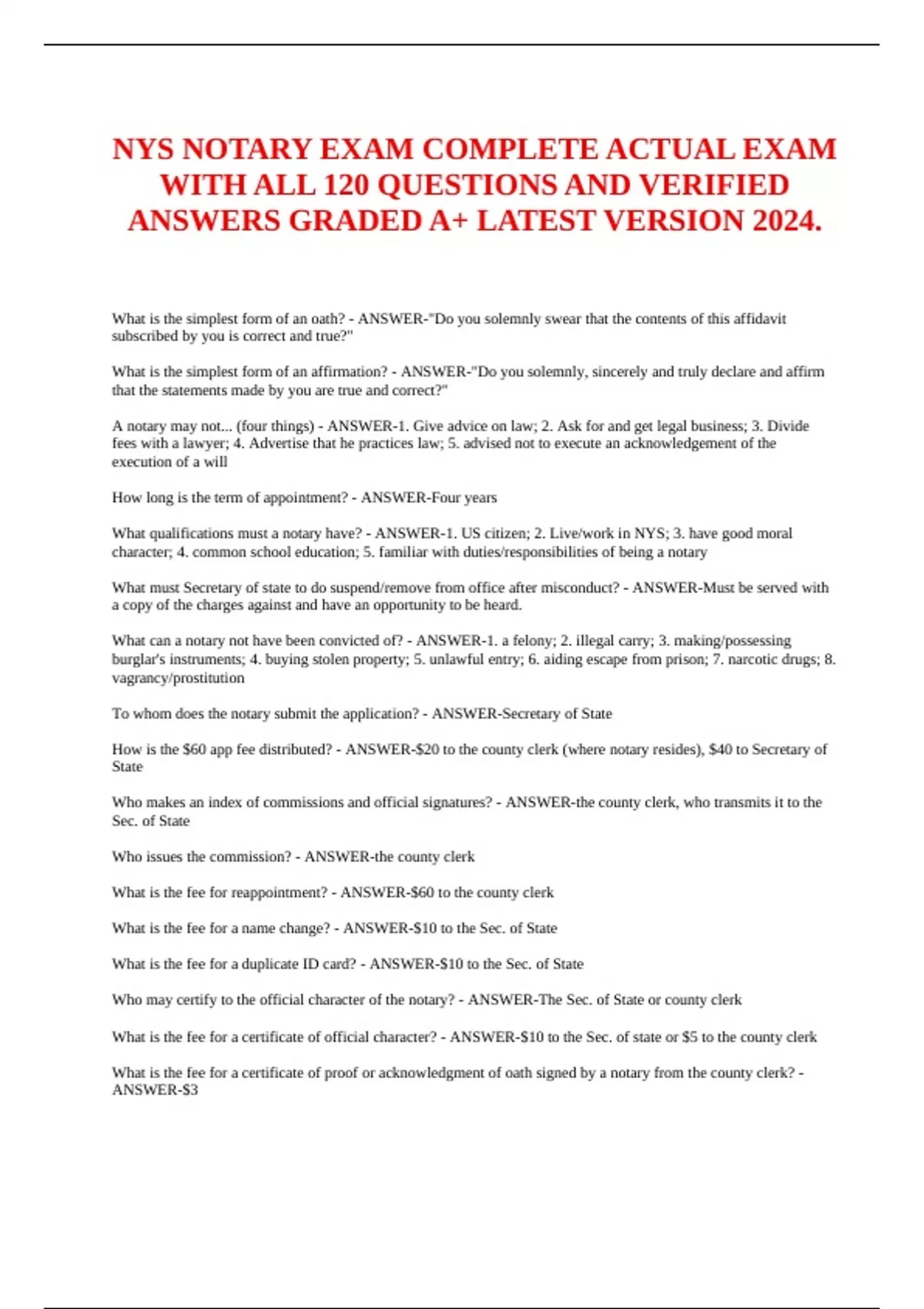 NYS NOTARY EXAM COMPLETE ACTUAL EXAM WITH ALL 120 QUESTIONS AND VERIFIED ANSWERS GRADED A+ LATEST VERSION 2024.