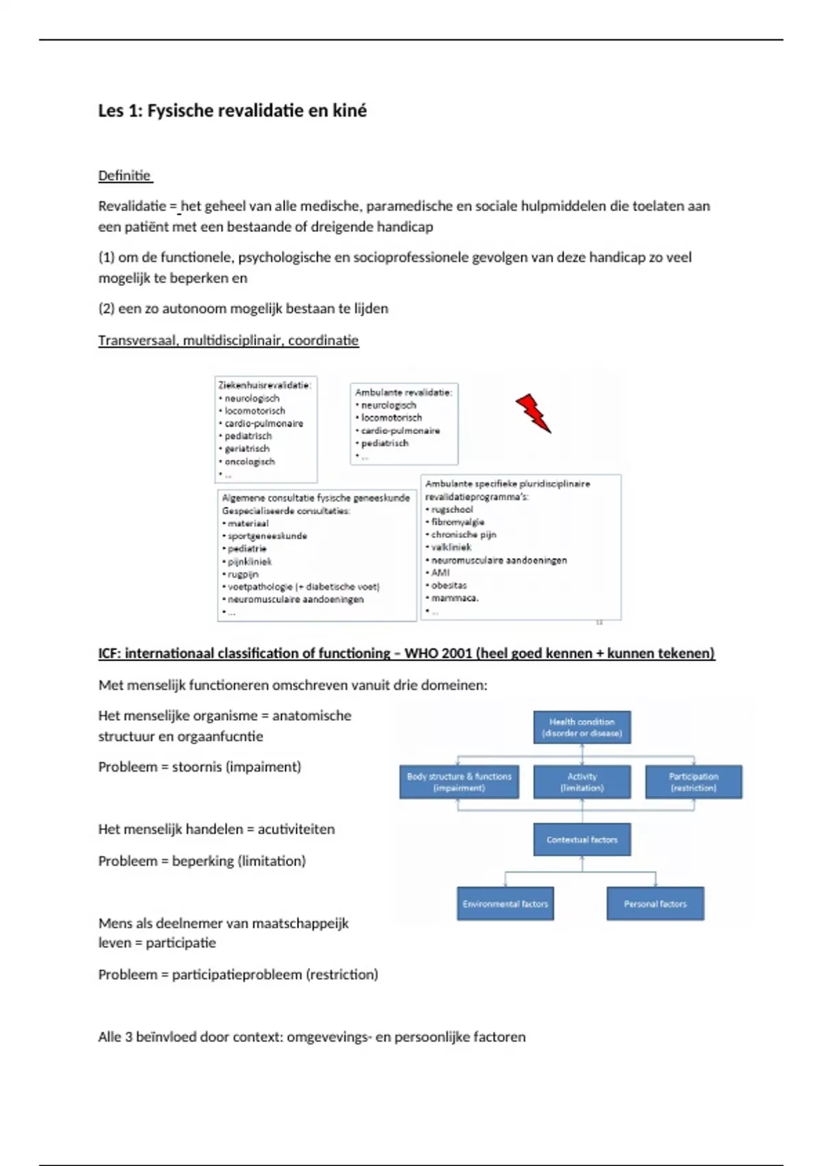 Samenvatting - Problemen van het bewegingsstelsel: fysische geneeskunde (niet het deel orthopedie). Samenvatting van alles wat te kennen is voor het examen, dus enkel stukken van de ppt die gevraagd zullen worden volgens de prof (die in de les werden aangeduid met bliksemschichten) Deze uitgebreide samenvatting behandelt de leerstof Fysische Geneeskunde en Revalidatie van de eerste master geneeskunde, met aandacht voor revalidatieprincipes, kinesitherapie, orthopedisch materiaal en pijnsyndromen. De inhoud omvat onder andere het ICF-model, RIZIV-nomenclatuur, CRPS, lage rugpijn, infiltraties, amputatierevalidatie en evidence-based behandelrichtlijnen. Ideaal als volledig overzicht voor examenvoorbereiding en klinisch redeneren.