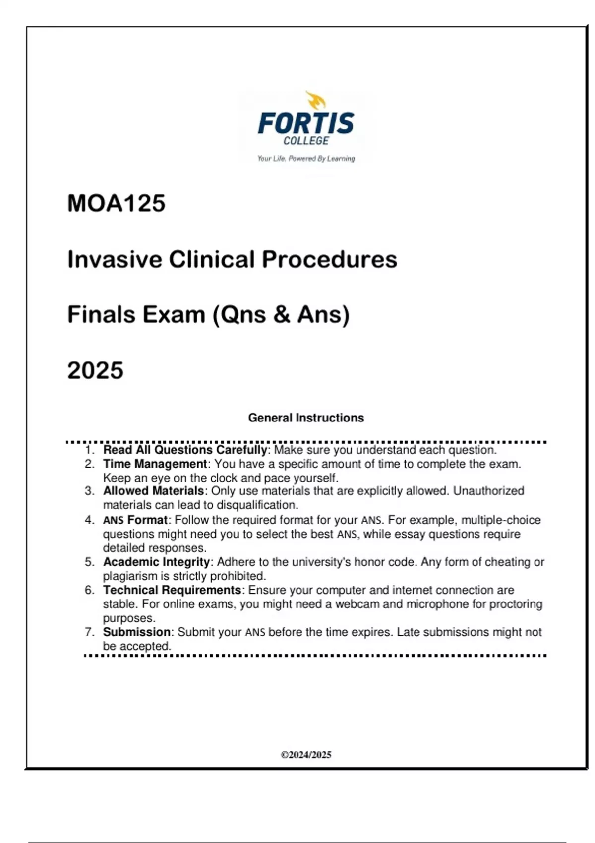 (Fortis) MOA125 Invasive Clinical Procedures Finals Exam ( Qns & Ans) 2025