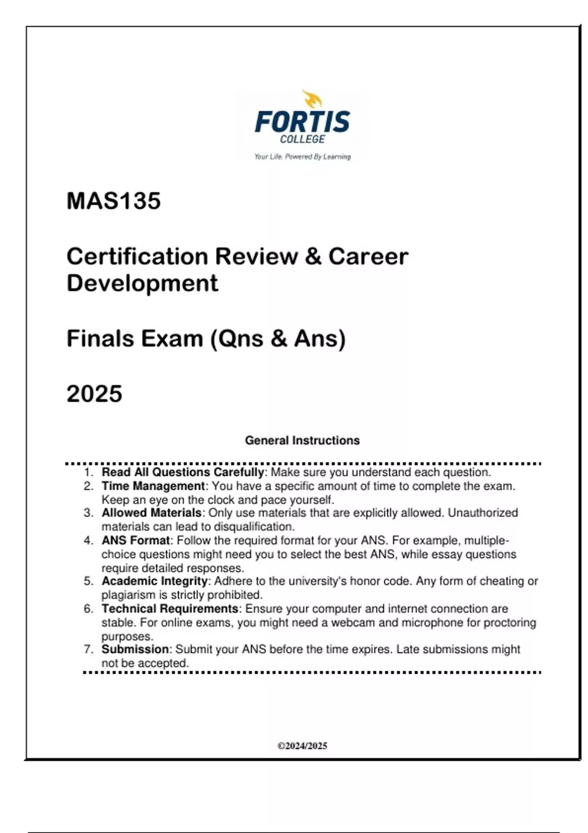 (Fortis) MAS135 Certification Review & Career Development Finals Exam ( Qns & Ans) 2025.(Fortis) MAS135 Certification Review & Career Development Finals Exam ( Qns & Ans) 2025.(Fortis) MAS135 Certification Review & Career Development Finals Exam ( Qns & Ans) 2025.