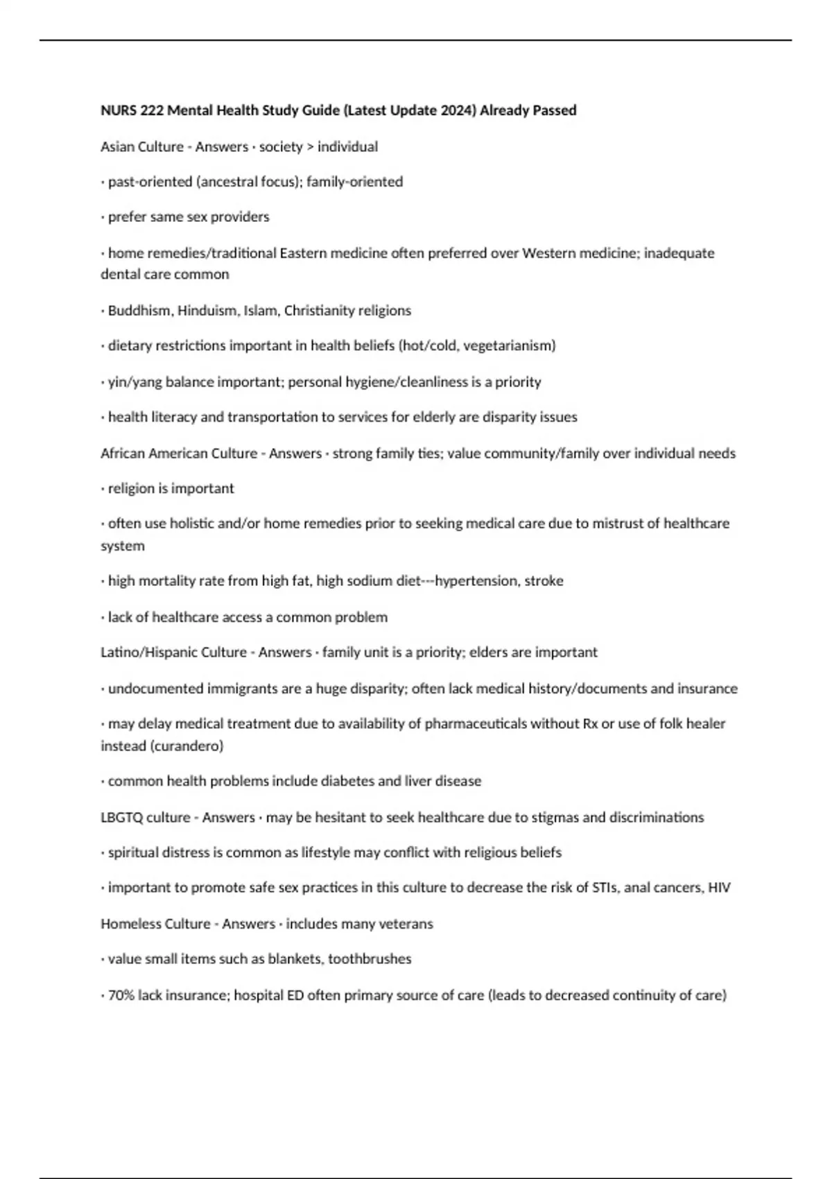 Latino/Hispanic Culture - Answers · family unit is a priority; elders are important