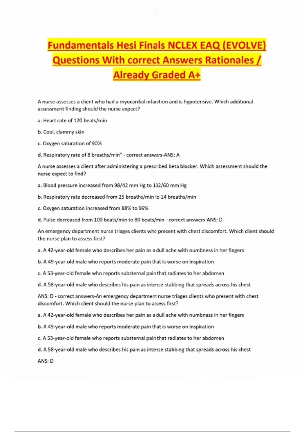 Fundamentals Hesi Finals NCLEX EAQ (EVOLVE) Questions With correct Answers Rationales / Already Graded A+ A nurse assesses a client who had a myocardial infarction and is hypotensive. Which additional assessment finding should the nurse expect? a. Heart rate of 120 beats/min b. Cool, clammy skin c. Oxygen saturation of 90% d. Respiratory rate of 8 breaths/min" - correct answers-ANS: A A nurse assesses a client after administering a prescribed beta blocker. Which assessment should the nurse expect to find? a. Blood pressure increased from 98/42 mm Hg to 132/60 mm Hg b. Respiratory rate decreased from 25 breaths/min to 14 breaths/min c. Oxygen saturation increased from 88% to 96% d. Pulse decreased from 100 beats/min to 80 beats/min - correct answers-ANS: D An emergency department nurse triages clients who present with chest discomfort. Which client should the nurse plan to assess first? a. A 42-year-old female who describes her pain as a dull ache with numbness in her fingers b. A 49-year-old male who reports moderate pain that is worse on inspiration c. A 53-year-old female who reports substernal pain that radiates to her abdomen d. A 58-year-old male who describes his pain as intense stabbing that spreads across his chest ANS: D - correct answers-An emergency department nurse triages clients who present with chest discomfort. Which client should the nurse plan to assess first? a. A 42-year-old female who describes her pain as a dull ache with numbness in her fingers b. A 49-year-old male who reports moderate pain that is worse on inspiration c. A 53-year-old female who reports substernal pain that radiates to her abdomen d. A 58-year-old male who describes his pain as intense stabbing that spreads across his chest ANS: D