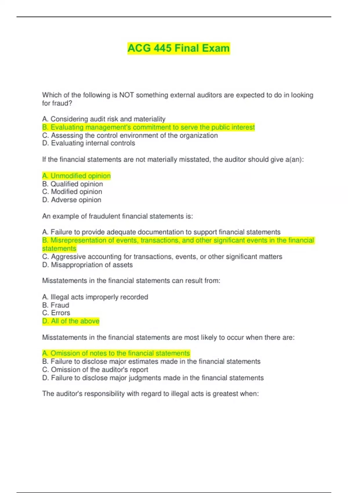 ,A. The illegal acts have a direct and immaterial effect on financial statement amounts