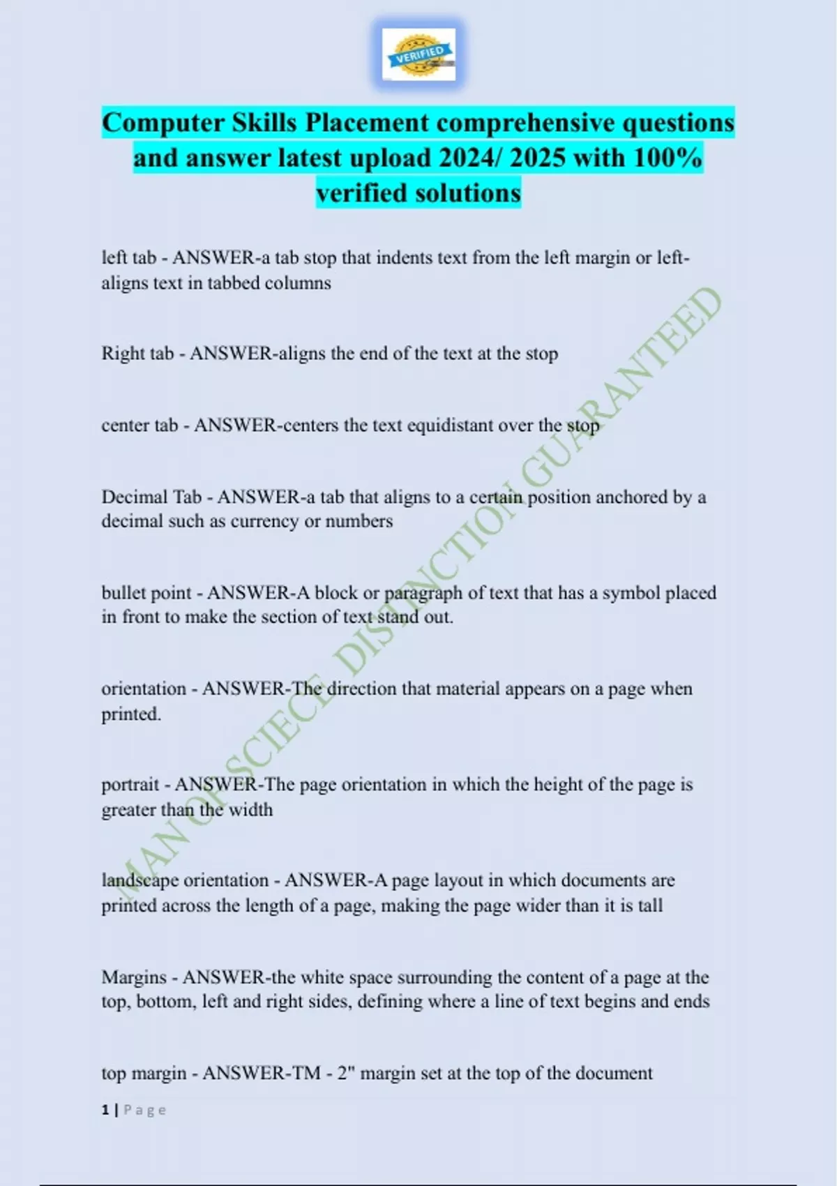 Computer Skills Placement comprehensive questions and answer latest upload 2024/ 2025 with 100% verified solutions