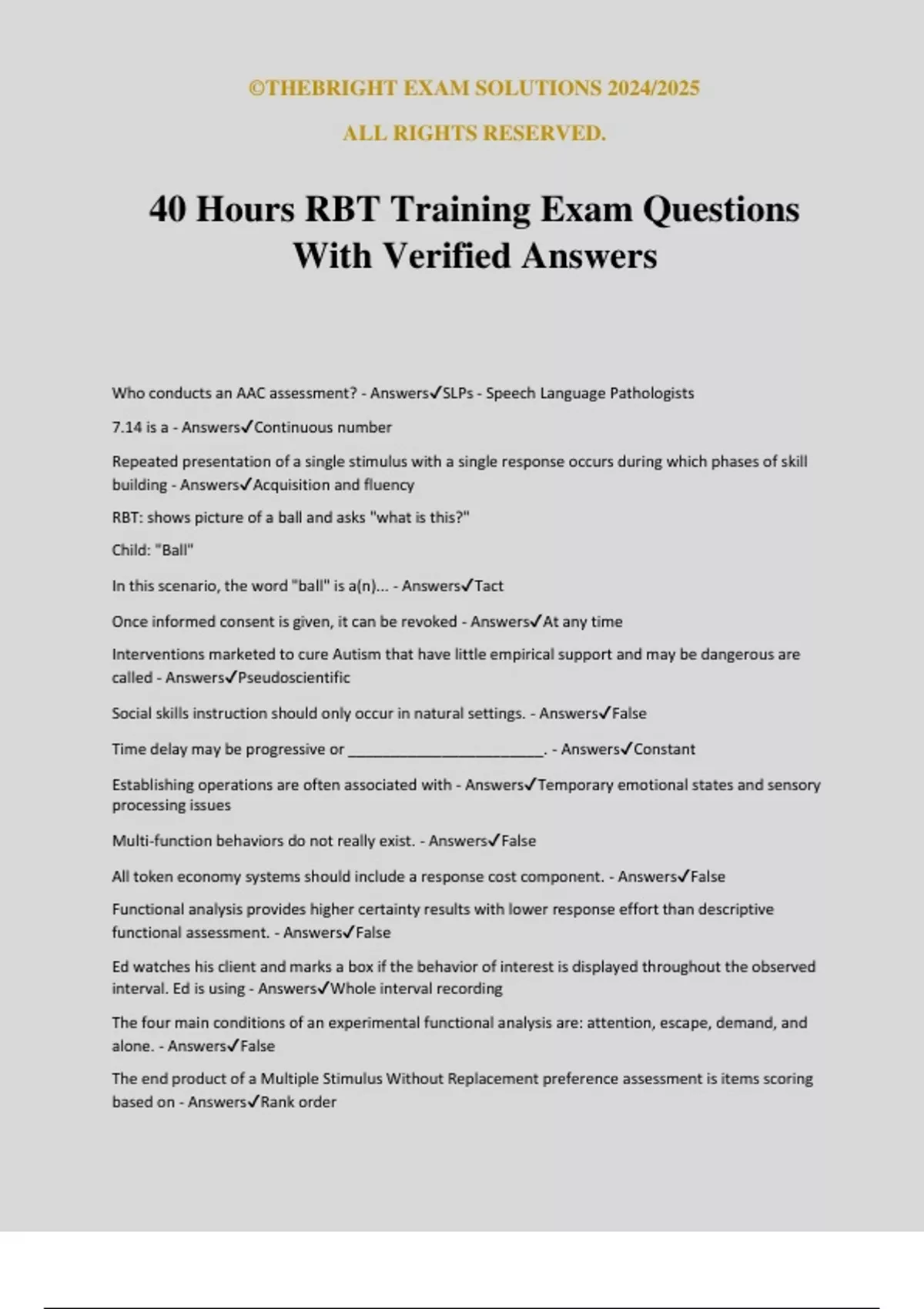 ©THEBRIGHT EXAM SOLUTIONS 2024/2025 ALL RIGHTS RESERVED. 40 Hours RBT Training Exam Questions With Verified Answers Who conducts an AAC assessment? - AnswersSLPs - Speech Language Pathologists 7.14 is a - AnswersContinuous number Repeated presentation of a single stimulus with a single response occurs during which phases of skill building - AnswersAcquisition and fluency RBT: shows picture of a ball and asks "what is this?" Child: "Ball" In this scenario, the word "ball" is a(n)... - AnswersTact Once informed consent is given, it can be revoked - AnswersAt any time Interventions marketed to cure Autism that have little empirical support and may be dangerous are called - AnswersPseudoscientific Social skills instruction should only occur in natural settings. - AnswersFalse Time delay may be progressive or _______________________. - AnswersConstant Establishing operations are often associated with - AnswersTemporary emotional states and sensory processing issues Multi-function behaviors do not really exist. - AnswersFalse All token economy systems should include a response cost component. - AnswersFalse Functional analysis provides higher certainty results with lower response effort than descriptive functional assessment. - AnswersFalse Ed watches his client and marks a box if the behavior of interest is displayed throughout the observed interval. Ed is using - AnswersWhole interval recording The four main conditions of an experimental functional analysis are: attention, escape, demand, and alone. - AnswersFalse The end product of a Multiple Stimulus Without Replacement preference assessment is items scoring based on - AnswersRank order