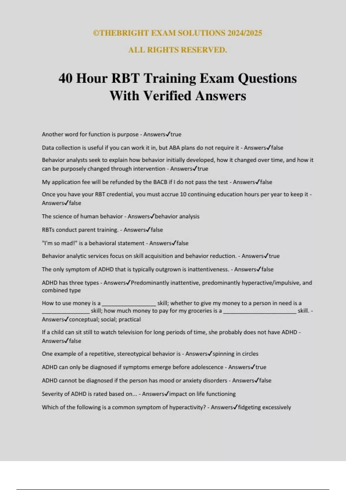©THEBRIGHT EXAM SOLUTIONS 2024/2025 ALL RIGHTS RESERVED. 40 Hour RBT Training Exam Questions With Verified Answers Another word for function is purpose - Answerstrue Data collection is useful if you can work it in, but ABA plans do not require it - Answersfalse Behavior analysts seek to explain how behavior initially developed, how it changed over time, and how it can be purposely changed through intervention - Answerstrue My application fee will be refunded by the BACB if I do not pass the test - Answersfalse Once you have your RBT credential, you must accrue 10 continuing education hours per year to keep it - Answersfalse The science of human behavior - Answersbehavior analysis RBTs conduct parent training. - Answersfalse "I'm so mad!" is a behavioral statement - Answersfalse Behavior analytic services focus on skill acquisition and behavior reduction. - Answerstrue The only symptom of ADHD that is typically outgrown is inattentiveness. - Answersfalse ADHD has three types - AnswersPredominantly inattentive, predominantly hyperactive/impulsive, and combined type How to use money is a _________________ skill; whether to give my money to a person in need is a _______________ skill; how much money to pay for my groceries is a _______________________ skill. - Answersconceptual; social; practical If a child can sit still to watch television for long periods of time, she probably does not have ADHD - Answersfalse One example of a repetitive, stereotypical behavior is - Answersspinning in circles ADHD can only be diagnosed if symptoms emerge before adolescence - Answerstrue ADHD cannot be diagnosed if the person has mood or anxiety disorders - Answersfalse Severity of ADHD is rated based on... - Answersimpact on life functioning Which of the following is a common symptom of hyperactivity? - Answersfidgeting excessively ©THEBRIGHT EXAM SOLUTIONS 2024/2025 ALL RIGHTS RESERVED. interrupting others' conversations Which of the following is listed as a possible support need for people with developmental disabilities? - Answerstransportation Developmental disabilities may result in four types of functional limitations: physical, mental, emotional, and behavioral. - Answersfalse IQ is more important than adaptive behavior when making a diagnosis of intellectual disability. - Answersfalse People with Autism Spectrum Disorder, Level 1, may have been diagnosed with Pervasive Developmental Disorder, NOS in the past - Answersfalse If the child is responding well to ADHD medication, behavioral interventions are not necessary. - Answersfalse The two domains of Autism Spectrum Disorder are... - AnswersBehavior and Social Communication Skills A developmental disability is a(n)... - Answersumbrella term Three components of adaptive behavior are... - AnswersConceptual, practical, and social skills It is okay to call a person with intellectual disability "retarded." - Answersfalse In order to be classified as a developmental disability, a disorder must have three components - Answerstrue Skinner was a strong believer in free will - Answersfalse ABC recording is a method of data collection developed by - Answersskinner Many children with Autism are selective eaters. - Answerstrue The first step in the scientific method is to form a hypothesis - Answersfalse FCT stands for Frequency of Correct Topography - Answersfalse Fisher's approach to problem behavior is to conduct a functional analysis followed by - Answersfunctional communication training The two categories of consequences are punishment and reprimands - Answersfalse The last step in the scientific method is to - Answersto draw a conclusion Walden Two describes - AnswersA Utopian community based on Skinnerian principles A stimulus is any environmental event that elicits a behavioral response. - Answerstrue The Lovaas method relies heavily on - Answersdiscrete trial training