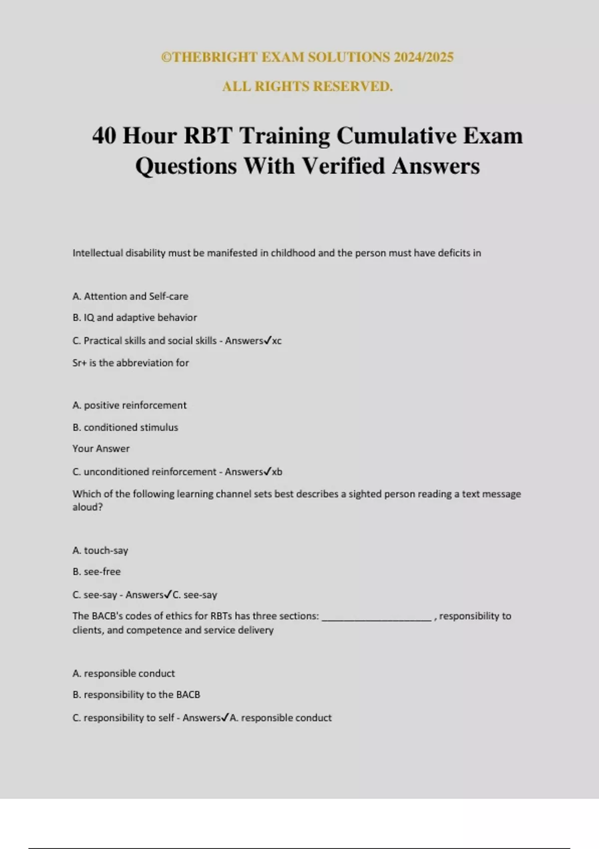 40 Hour RBT Training Cumulative Exam Questions With Verified Answers