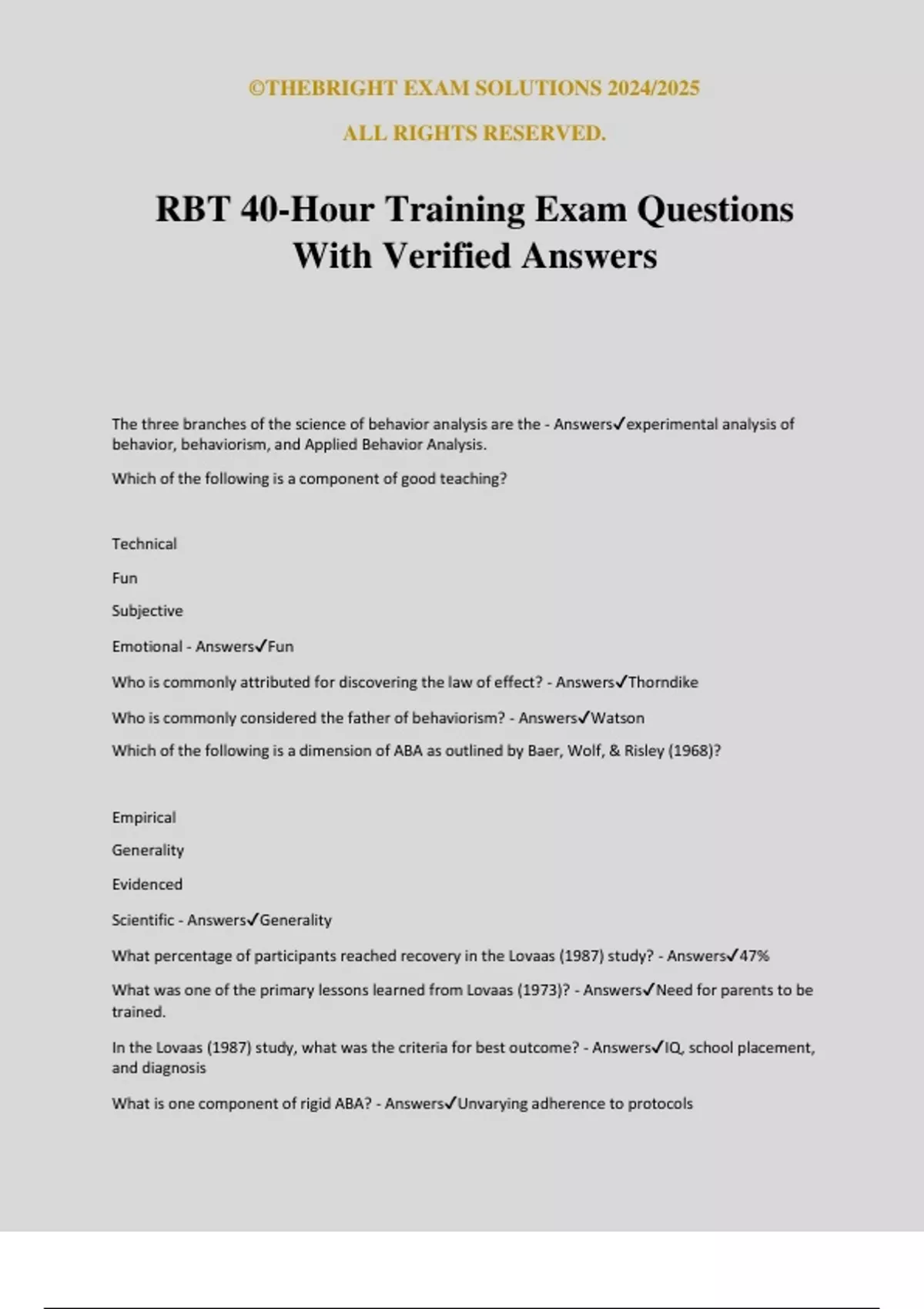 ©THEBRIGHT EXAM SOLUTIONS 2024/2025 ALL RIGHTS RESERVED. RBT 40-Hour Training Exam Questions With Verified Answers The three branches of the science of behavior analysis are the - Answersexperimental analysis of behavior, behaviorism, and Applied Behavior Analysis. Which of the following is a component of good teaching? Technical Fun Subjective Emotional - AnswersFun Who is commonly attributed for discovering the law of effect? - AnswersThorndike Who is commonly considered the father of behaviorism? - AnswersWatson Which of the following is a dimension of ABA as outlined by Baer, Wolf, & Risley (1968)? Empirical Generality Evidenced Scientific - AnswersGenerality What percentage of participants reached recovery in the Lovaas (1987) study? - Answers47% What was one of the primary lessons learned from Lovaas (1973)? - AnswersNeed for parents to be trained. In the Lovaas (1987) study, what was the criteria for best outcome? - AnswersIQ, school placement, and diagnosis What is one component of rigid ABA? - AnswersUnvarying adherence to protocols ©THEBRIGHT EXAM SOLUTIONS 2024/2025 ALL RIGHTS RESERVED. What is a definition of a Progressive approach to ABA? - AnswersCombining the science and art of ABA What is the crux of progressive ABA? - AnswersClinical judgement What is one aspect of the learner that is assessed when using clinical judgment? - AnswersReceptivity What were one of the rights outlined by Van Houten et al. (1988)? Learners welfare Best outcomes Certified supervisors Registered Behavior Technicians - AnswersLearners welfare Teaching children to label state capitals may be a violation of which of the rights outlined by Van Houten et al. (1988)? - AnswersLearning functional skills What are the other two levels created by the BACB? - AnswersBCBA & BCaBA Which of the following is one of the requirements to obtain the RBT credential? - AnswersCompleting 40 hours of training What is one problem with a sibling of an RBT being that RBTs supervisor? - AnswersPotential for the development of a dual relationship How many face-to-face meetings must occur per month between the RBT and the supervisor? - Answers2 What percentage of your total hours of an RBT must be spent in supervision? - Answers5% What is one of your responsibilities as an RBT? - AnswersDirect instruction According to Autism Partnership Foundation what are the RBT standards? - AnswersMinimal Critical thinking important to intervention for individuals diagnosed with ASD to ensure that - Answersbest procedures are being implemented. When receiving feedback which of the following should be avoided? - AnswersTaking feedback personally When receiving feedback which of the following should be done? - AnswersFollowing through on making changes Which of the following is the best resource for keeping updated on the field of ABA? - AnswersJournal articles Which is an example of a soft skill? - AnswersCompassion