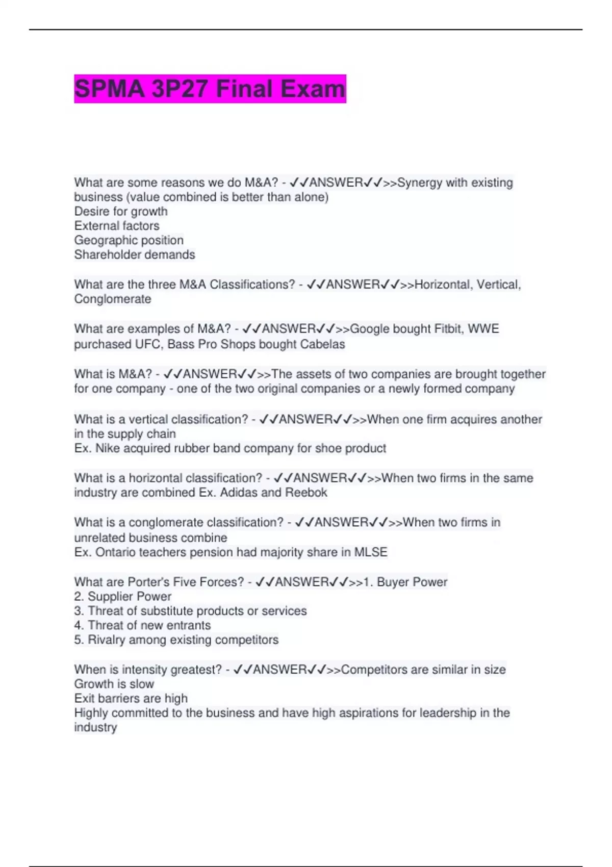 SPMA 3P27 Final Exam What are some reasons we do M&A? - ANSWERSynergy with existing business (value combined is better than alone) Desire for growth External factors Geographic position Shareholder demands
