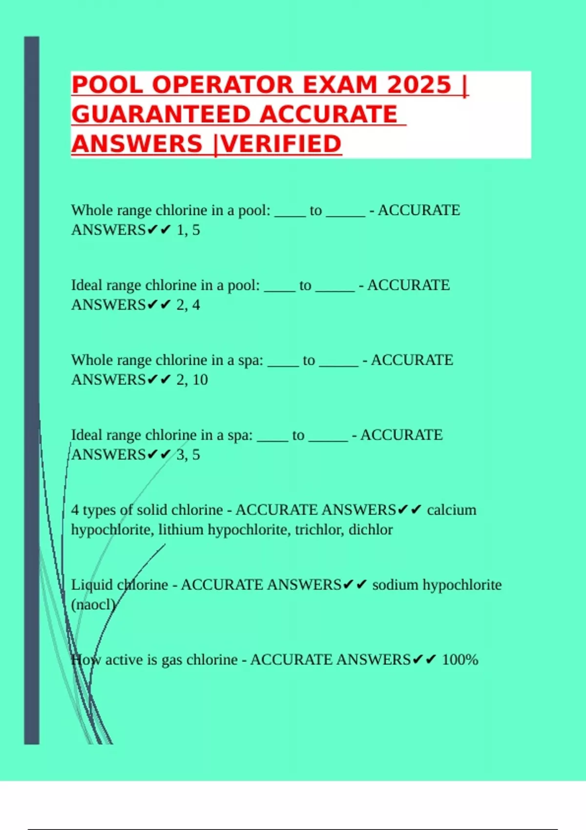 ANSWERS✔✔ calcium hypochlorite (8.5 - 11, used to super chlorinate