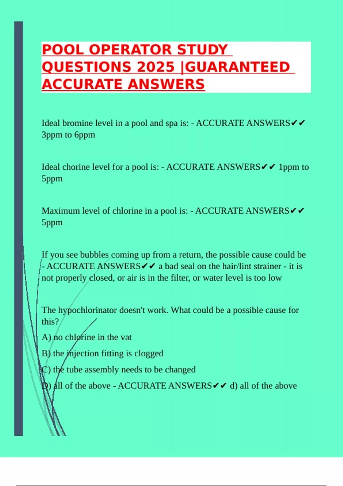 Ideal chorine level for a pool is: - ACCURATE ANSWERS✔✔ 1ppm to